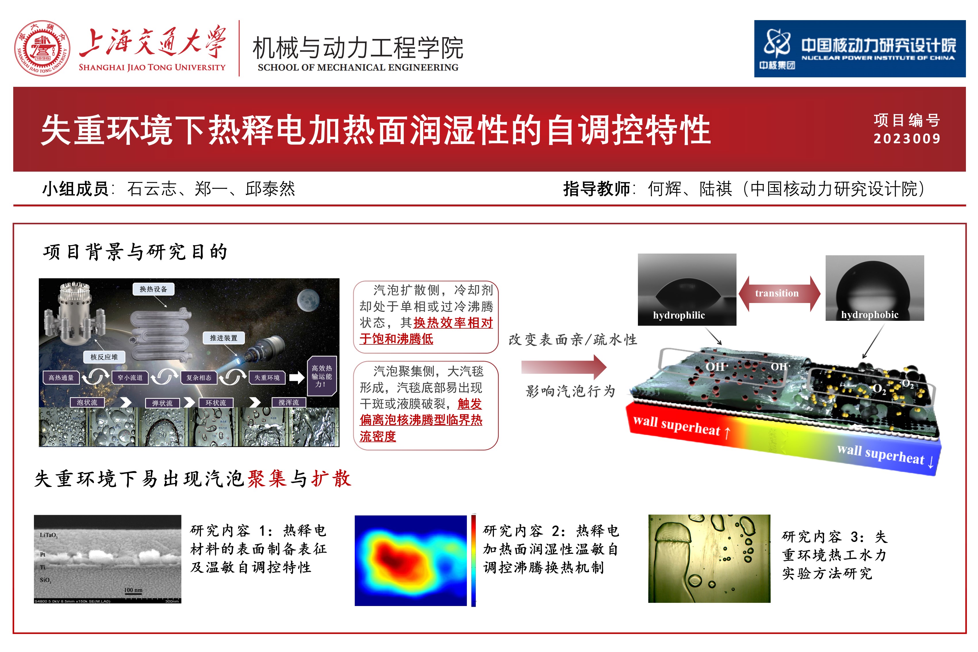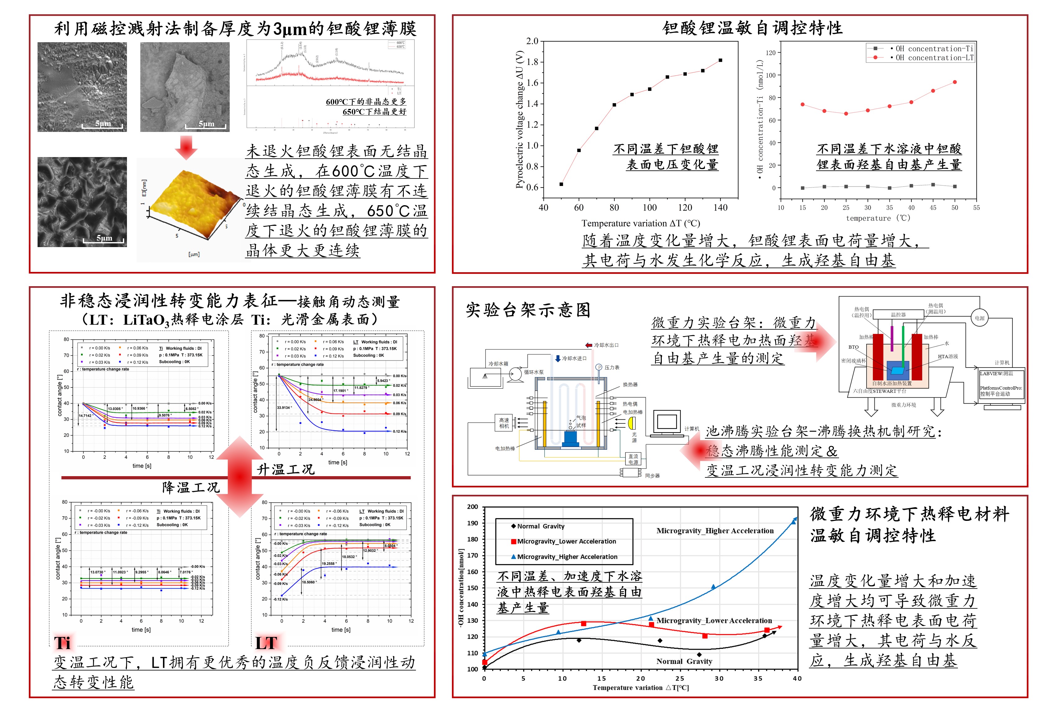 本项目成功在金属钛衬底上制备了微米厚度的高致密热释电涂层,并完成了对热释电涂层晶体的结构分析、涂层表面与断面围观形貌分析,得到了温度变化与表面自由基产生量的关系曲线;成功设计并搭建了池沸腾试验台架,并在稳态下获得了热释电涂层对沸腾传热增强的定量关系,非稳态下获得了热释电材料基于温度负反馈的浸润性自适应变化效应的定量关系,评估了各影响因素对实验结果的影响,总结出了热释电材料表面浸润性温敏自适应调节的定量关系;成功设计并装配了微重力环境的模拟装置,探究了热释电材料在变温及微重力环境下的浸润性改变的机理,并利用化学方法对微重力环境下热释电材料的浸润性进行了分析。