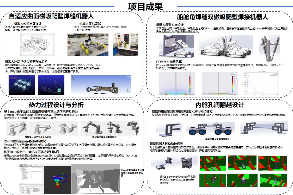 本项目旨在项目组中的每个成员根据不同的焊接场景分别设计针对弧形表面的单自由度焊缝跟踪焊接机器人、针对直角焊缝的双磁吸爬壁焊接机器人、针对过焊孔处焊接的仿人机械臂焊接机器人、针对底内舱越障的钻孔机器人,用以替代船舶内舱恶劣环境下的人工作业。这些机器人相较于传统人工作业,既节省了人力成本,效率也显著提升,工作过程的安全性也能得到保障,对维护船舶结构的稳定性具有重要作用。