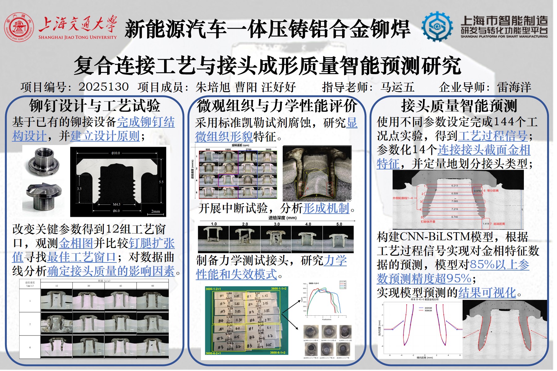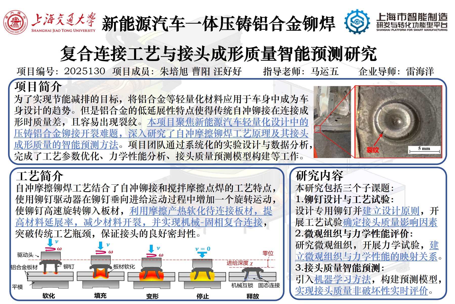 为了实现节能减排的目标,将铝合金等轻量化材料应用于车身中成为车身设计的趋势。但是铝合金的低延展性特点使得传统自冲铆接在连接成形时质量差,且容易出现裂纹。本项目聚焦新能源汽车轻量化设计中的压铸铝合金铆接开裂难题,深入研究了自冲摩擦铆焊工艺原理及其接头成形质量的智能预测方法。项目团队通过系统化的实验设计与数据分析,完成了工艺参数优化、力学性能分析、接头质量预测模型构建等工作。