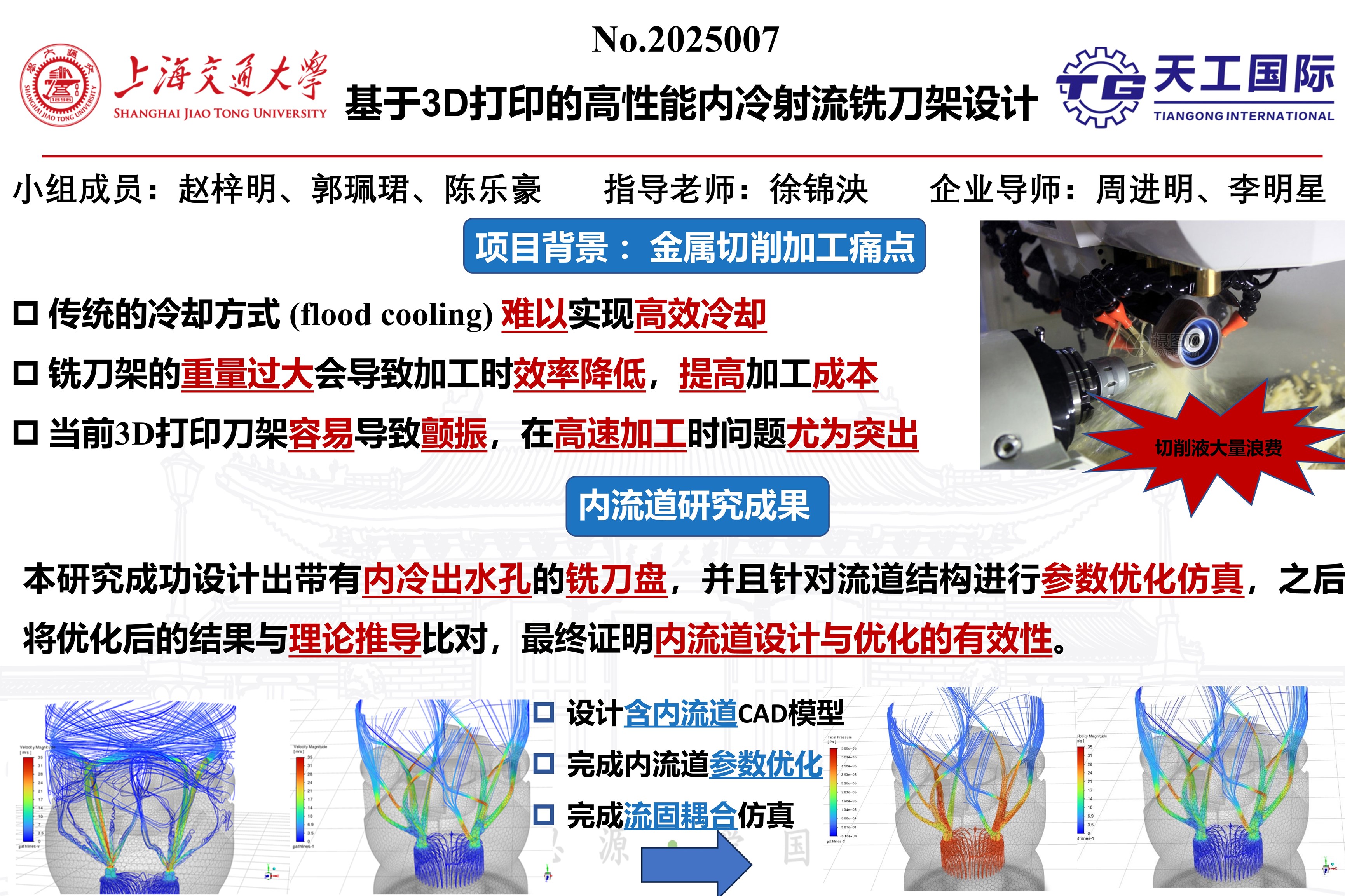 本项目聚焦于研发基于 3D 打印的高性能内冷射流铣刀架,解决传统铣刀架在高速切削难加工材料时冷却效果差、振动大和重量过大的问题。本项目通过流仿真优化内冷通道结构,实现冷却液精准喷射;采用状态空间稳定性分析确定最优齿数分布;运用拓扑优化与晶格结构,在保证强度与刚度的前提下实现轻量化。最终,借助激光选区熔化工艺成功制造出铣刀架实体。实验表明,该设计在高速切削 TC4 钛合金时,相比市售铣刀架,磨损速率降低约 87.5%,展现出显著的性能优势。