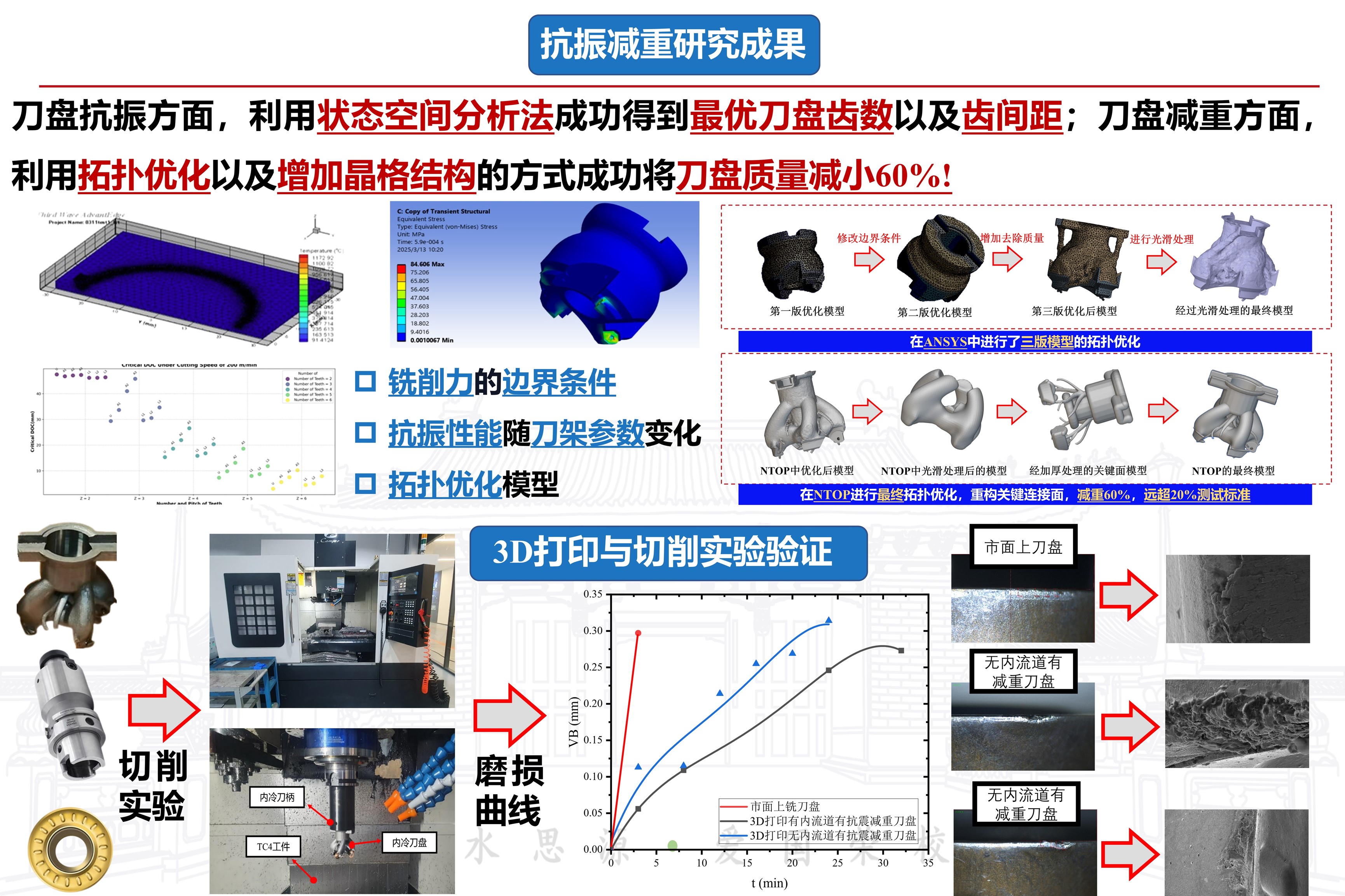 项目成功实现了内冷通道的优化设计,建立了铣刀架完整 CAD 模型,创新的三点精准射流内冷通道结构使前刀面喷嘴出口速度达 31.0m/s,后刀面喷嘴出口速度达 22.6m/s,经仿真优化,支流道交汇处流体性能损失减少 38%,出口速度提升 33%以上。在抗振减重方面,通过模态分析确定了 4 齿均布的刀架结构,平衡了生产效率与抗振性能,利用拓扑优化与晶格结构实现整体减重约 60%,质量控制在 180g 以内。3D 打印与切削实验显示,与市售铣刀架相比,所设计的铣刀架磨损速率降低约 87.5%。