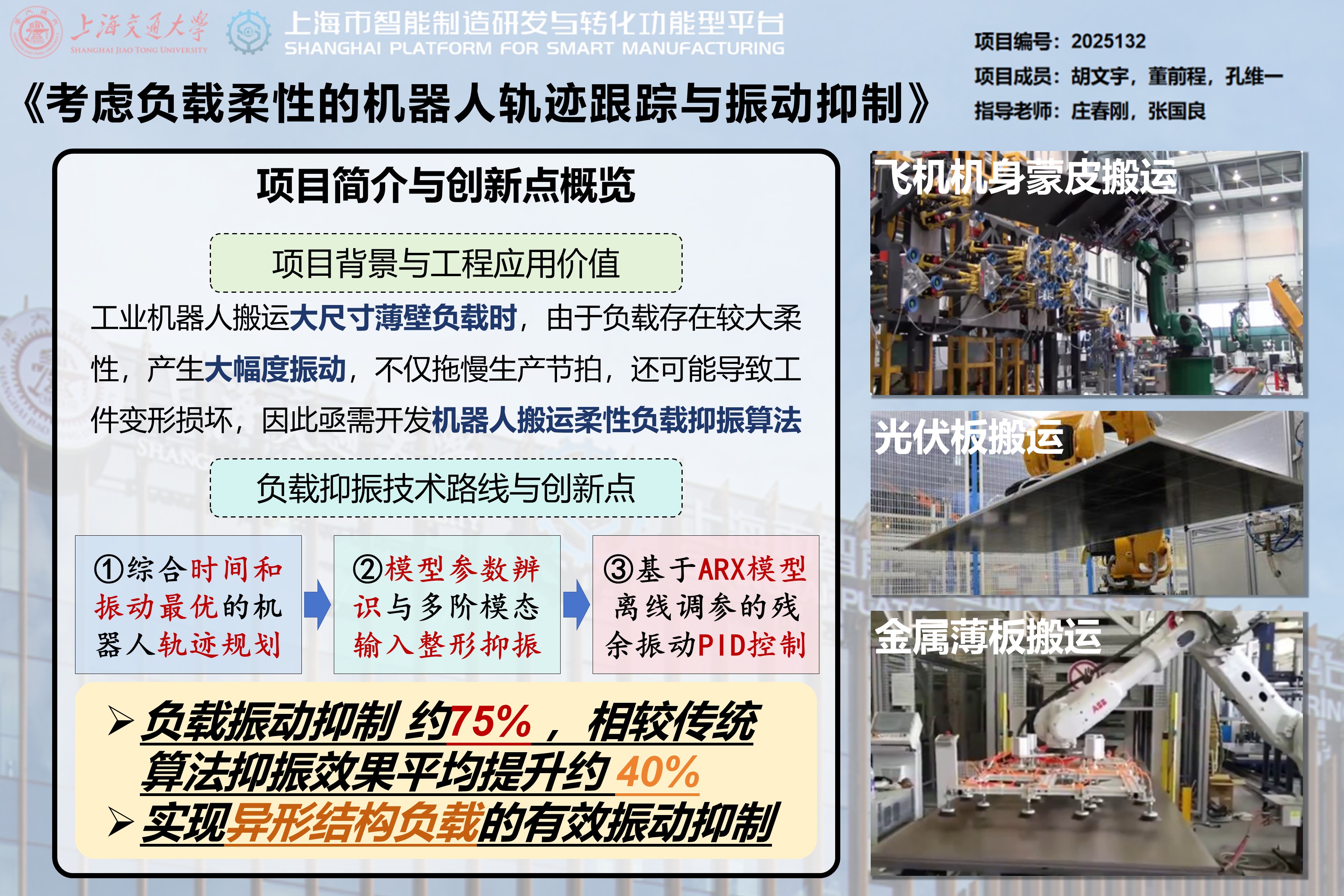 本项目聚焦于工业机器人在搬运大尺寸薄壁负载(如飞机机身蒙皮、光伏板、金属薄板)过程中因负载柔性引起的剧烈振动问题。柔性负载在搬运过程中容易产生大幅度振动,不仅拖慢生产节拍,还可能导致工件变形或损伤,进而降低自动化生产效率。针对这一工程痛点,项目系统性开展了柔性负载建模、轨迹规划优化、以及基于模型的振动抑制策略研究,最终实现机器人在搬运柔性负载时的高精度轨迹跟踪与高效振动控制。
