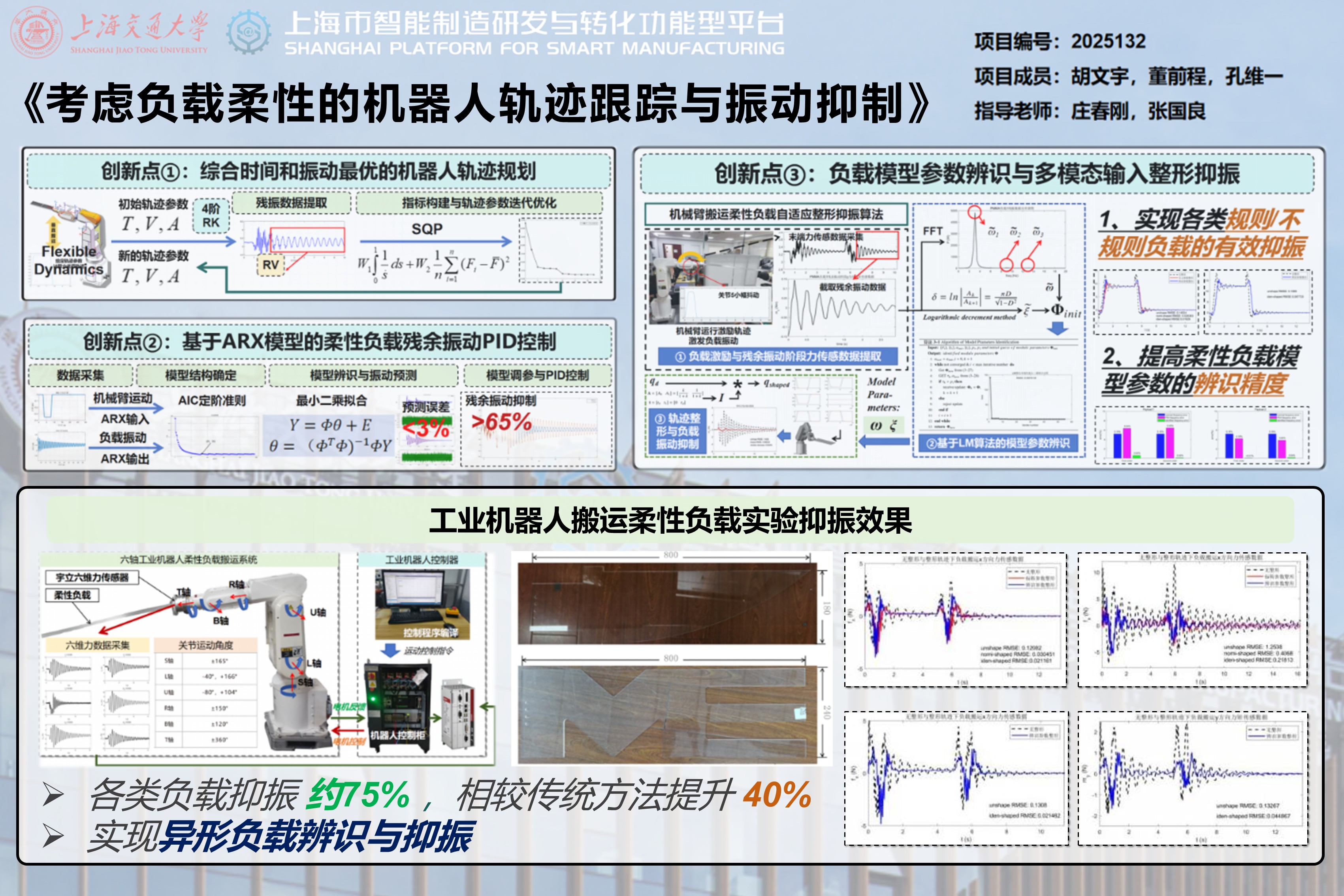 项目成功构建了柔性负载辨识与抑振控制一体化方案,实现轨迹规划与模型控制双重优化。通过多阶模态输入整形与残余振动控制,柔性负载的振动幅值平均降低约75%,相较传统算法提升约40%。该方法广泛适用于薄壁件搬运场景,显著提高了自动化搬运的安全性与效率。此外,研究成果已在多类典型负载(如异形PMMA板与6061铝合金板)实验中验证,展示出良好的通用性与工程应用前景。