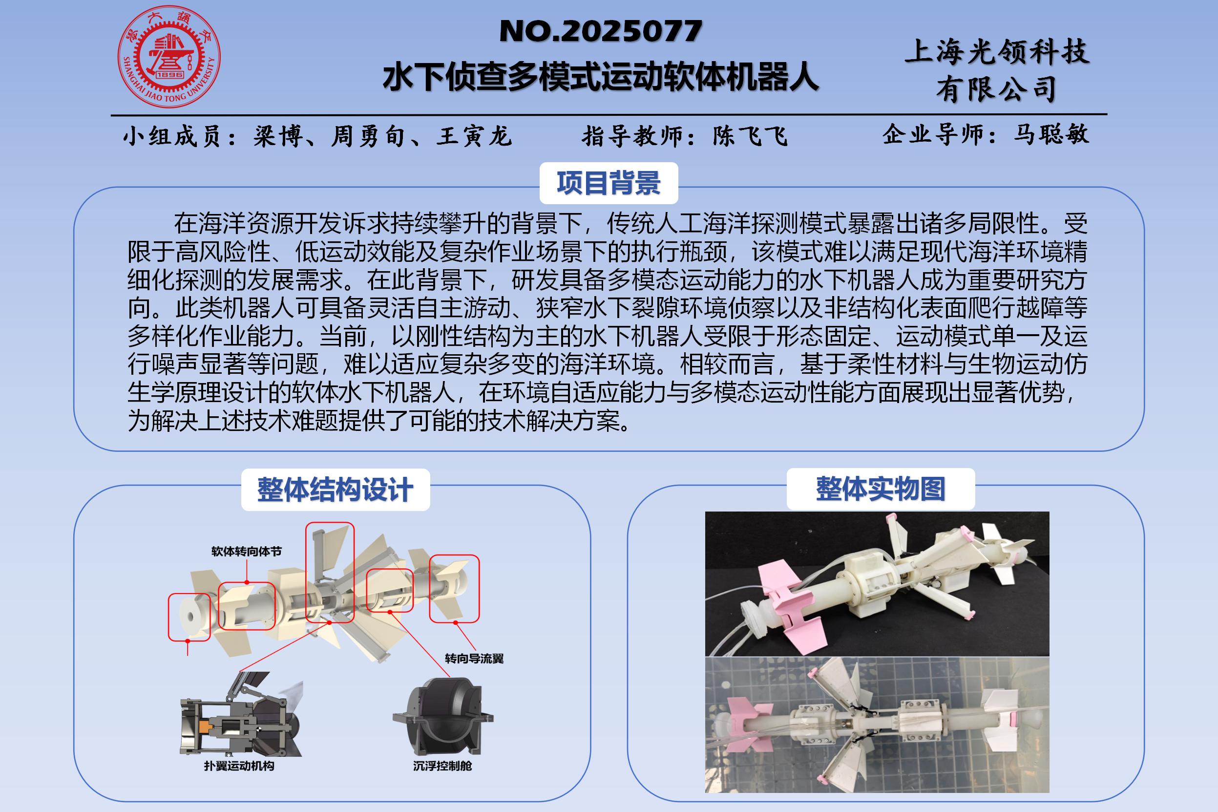 本项目针对海洋资源开发与生态保护领域对高适应性水下探测装备的迫切需求,聚焦传统人工探测及刚性水下机器人在复杂海洋环境中面临的技术瓶颈。针对传统作业方式存在人员风险高、作业效率低,以及刚性机器人运动模式单一、环境适应性不足等核心问题,本研究创新性地提出一种具有多模态运动能力的仿生软体水下机器人系统。通过融合柔性智能材料与仿生学原理,构建可自主实现自由沉浮、三维巡游及表面越障的智能作业平台,为深海科考、海底资源勘探及海洋生态监测提供新的可能技术解决方案。