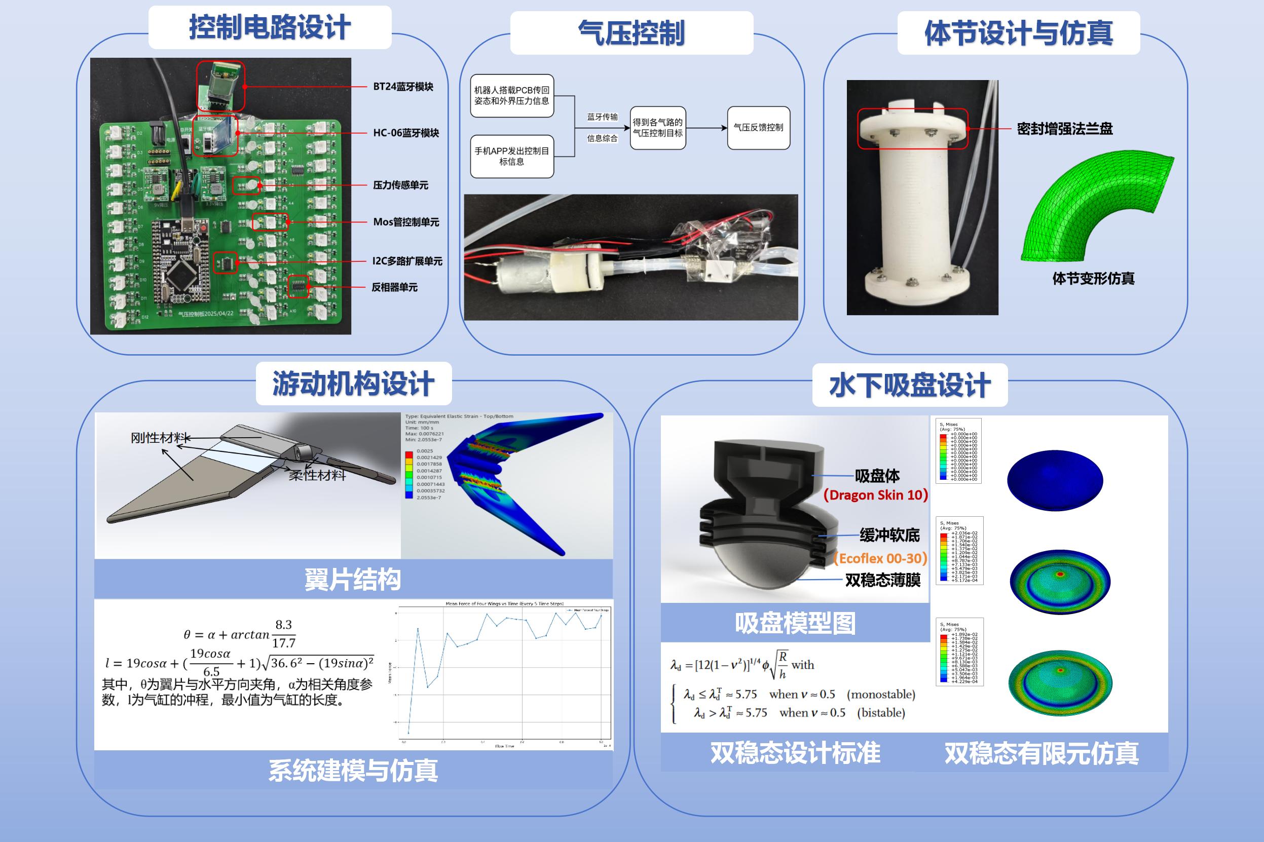 本项目研制出一种具备三维空间多模态运动能力的仿生软体水下机器人。主要成果包括:1) 系统设计方面,研制出了总长0.486m、质量1031g的轻量化本体,通过硅胶柔性骨架与仿生扑翼的协同设计,实现前向游动;2) 驱动方式方面,设计了基于硅胶柔性材料的被动复位机构,能够在周期扑翼的复位阶段自动降低拨水面积,减少水流阻力,提升游动效率;3) 吸附系统方面,提出了具有双稳态特性的仿生吸盘结构设计,预计可通过预负压生成实现接触瞬态的被动触发式吸附;4) 运动控制方面,设计了分布式的气压输入控制系统,通过蓝牙系统进行信息同步,实现精确、便捷的正负气压控制。