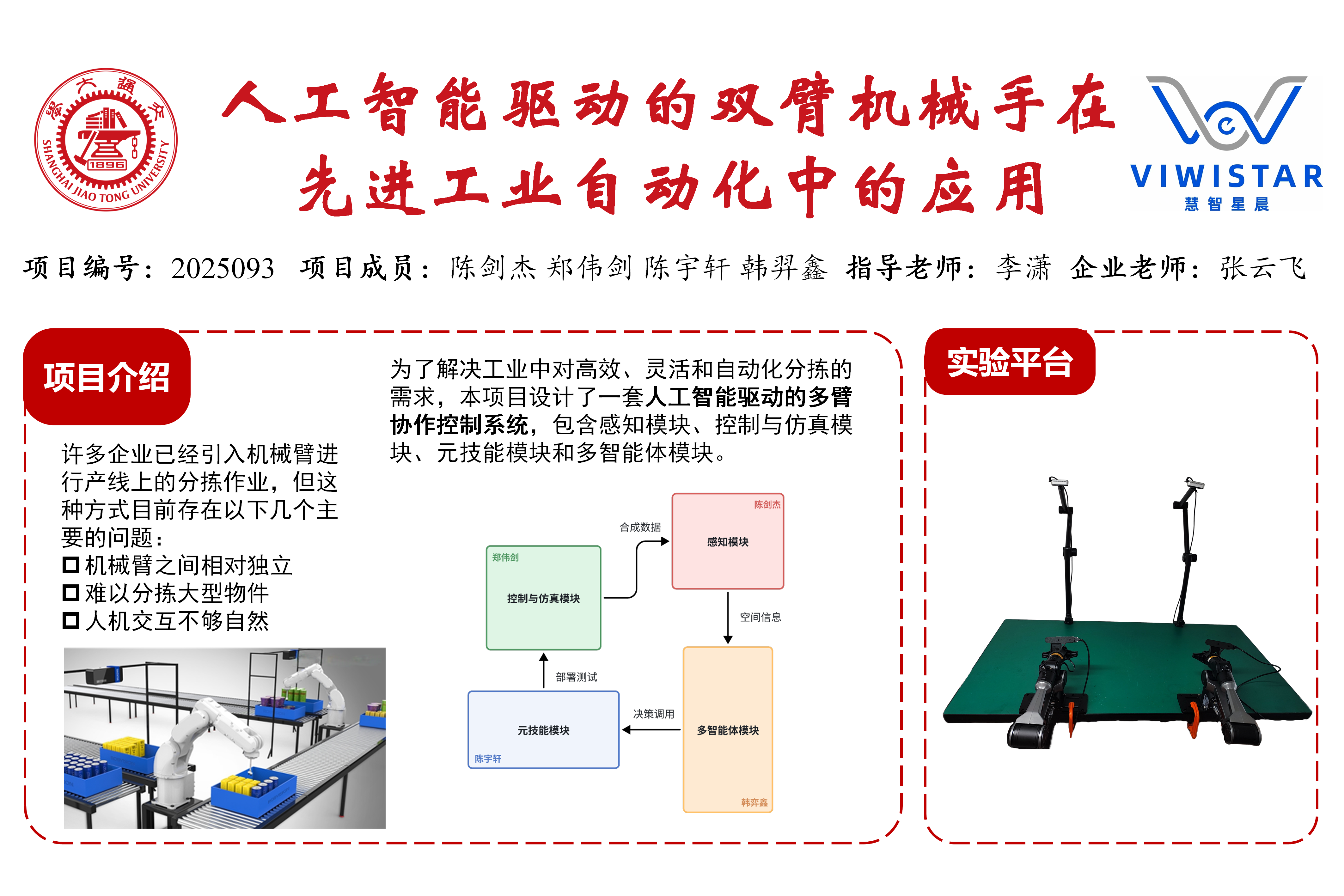 本项目的主题为“人工智能驱动的双臂机械手在先进工业自动化中的应用”,聚焦于当前工业分拣场景中面临的多机械臂协作难、交互不自然和大型物体操作困难等问题。项目基于人工智能技术,设计并实现了一套多臂协作控制系统,涵盖感知、控制仿真、元技能及智能体等多个模块,旨在提升机械臂在复杂工业环境下的智能化与灵活性。系统依托于视觉感知与语言理解能力,集成控制仿真平台与实际硬件实验平台,结合虚实融合方案,构建完整的从任务理解、操作规划到动作执行的闭环流程。