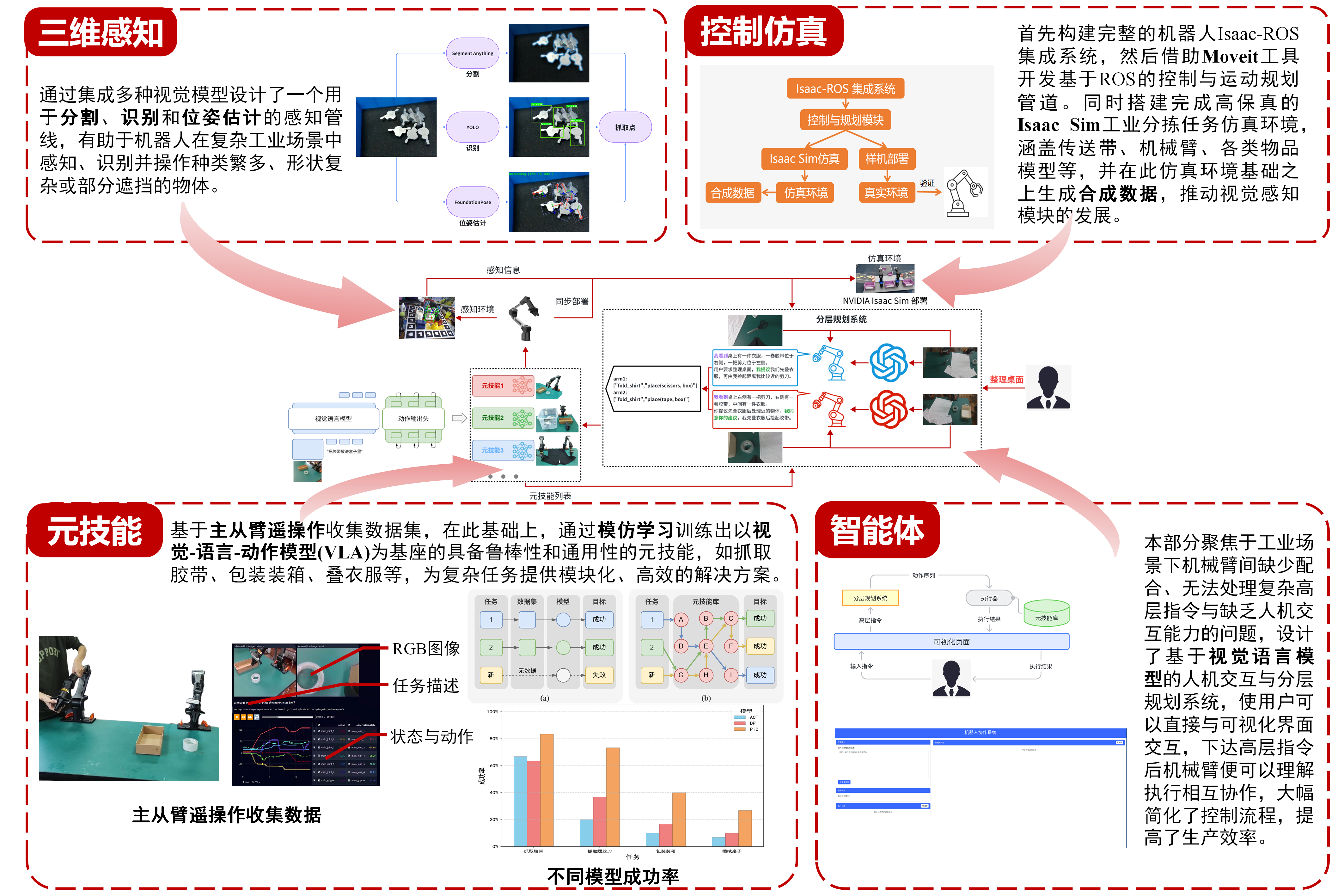 项目旨在构建一个智能驱动的多臂协作控制系统,提升工业自动化生产中的柔性分拣与复杂操作能力。为此,系统集成了四大核心模块:三维感知模块用于识别和理解复杂场景下的物体类型和形状;控制与仿真模块通过Isaac Sim和ROS进行虚拟任务训练和路径规划;元技能模块基于从人类示教中提取的操作动作,训练通用技能模型以支持多类任务;智能体模块实现人机自然交互,通过语言和视觉指令生成高层策略计划。最终目标是实现高效协同、多任务处理和人机融合的自动化系统,以适应未来智能制造的发展需求。