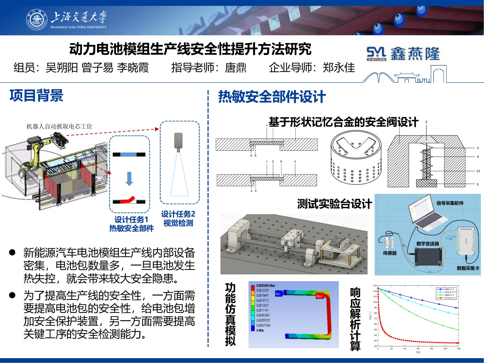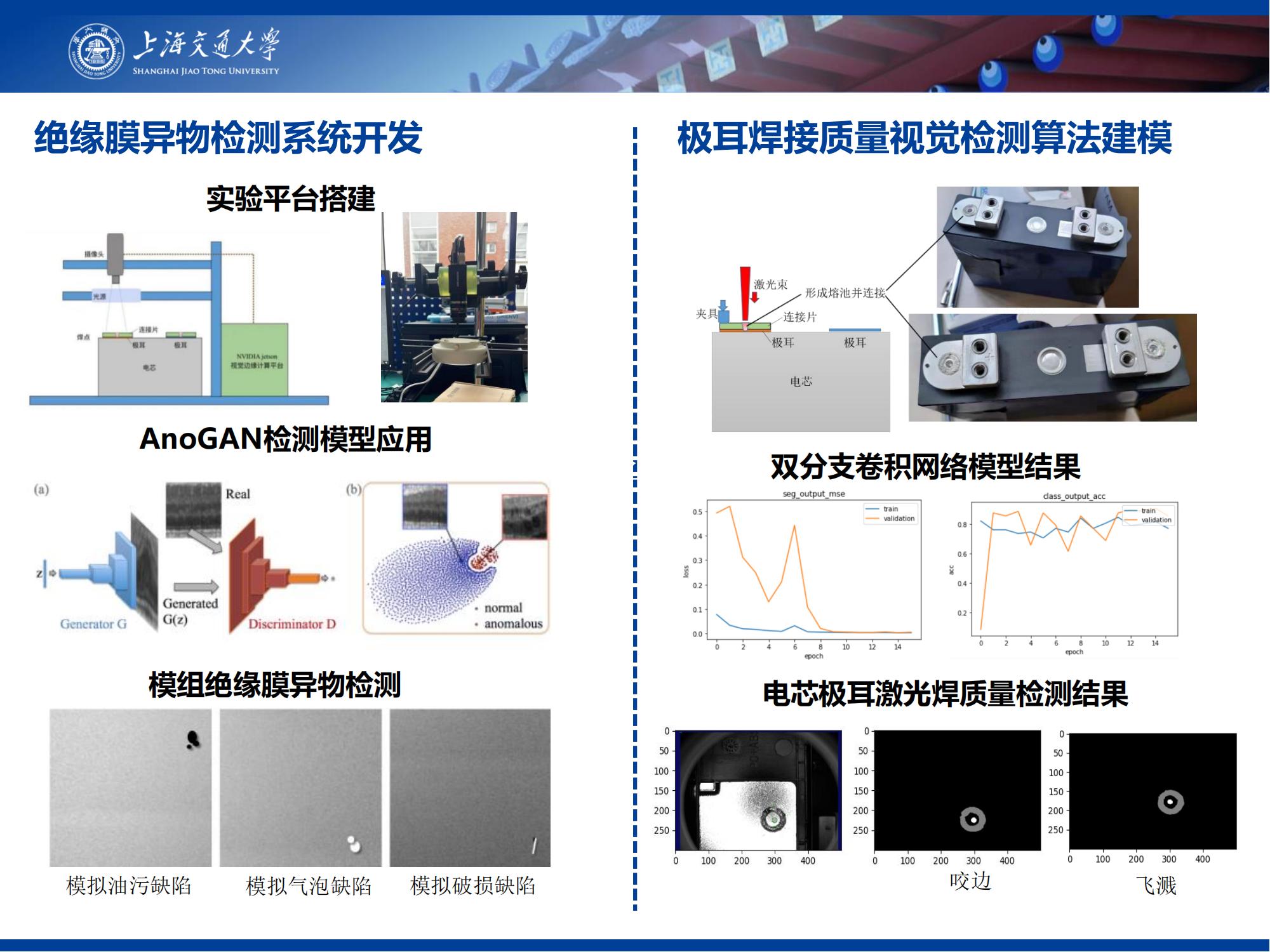 本项目首先采用形状记忆合金用于热敏安全部件设计,对其力学、响应性能进行调研,并在此基础上,具体结合电池包内部的热管理系统,设计多重热敏安全部件。其次,通过搭建基于机器视觉的质量检测平台,开发一套基于目标检测算法的“电池包焊装质量缺陷识别系统”,实现了电池包上的组装、焊接等缺陷的特征识别和检测报警。最后,开发一套基于双分支卷积网络模型的“电芯极耳焊接缺陷”在线检测系统,较好地实现了焊缝信息提取和焊缝质量在线判断任务。