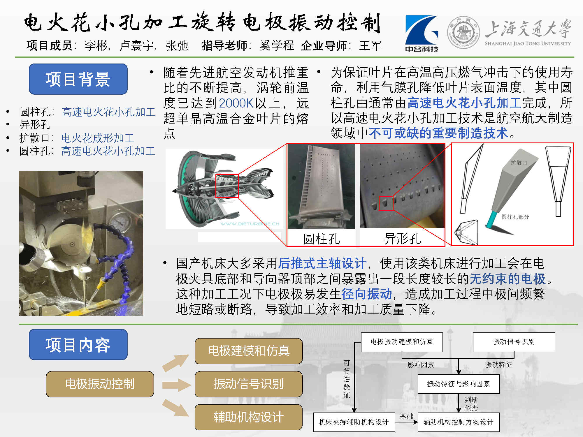 总体目标是设计一款适用于中谷集团现有的后推式主轴机床的电极辅助夹持装置,具体包括:建立数学模型以及电极有限元模型,探究电极丝振动成因,分析电极丝振动的影响因素;搭建信号采集系统,对电火花加工过程中振动信号进行分析与识别,寻找电极发生振动时的特征信号;基于仿真结果以及客户需求完成夹持机构、升降机构的详细设计,绘制工程图图纸,最后进行样机的加工装配,验证抑制振动的有效性。