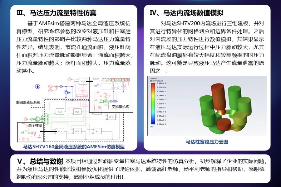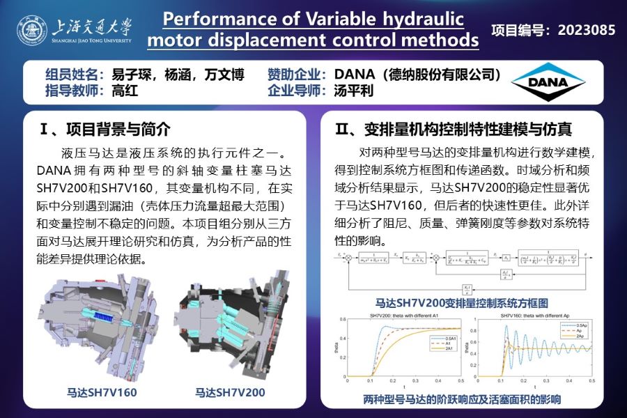 液压马达是液压系统的执行元件之一。DANA拥有两种型号的斜轴变量柱塞马达SH7V200和SH7V160,其变量机构不同,在实际中分别遇到漏油(壳体压力流量超最大范围)和变量控制不稳定的问题。本项目组分别从三方面对马达展开理论研究和仿真,为分析产品的性能差异和优化设计提供理论依据和技术支持。以本研究为基础,可以拓展到更复杂的斜轴变量柱塞马达上,为不同液压马达的仿真模型建立提供理论和技术基础。