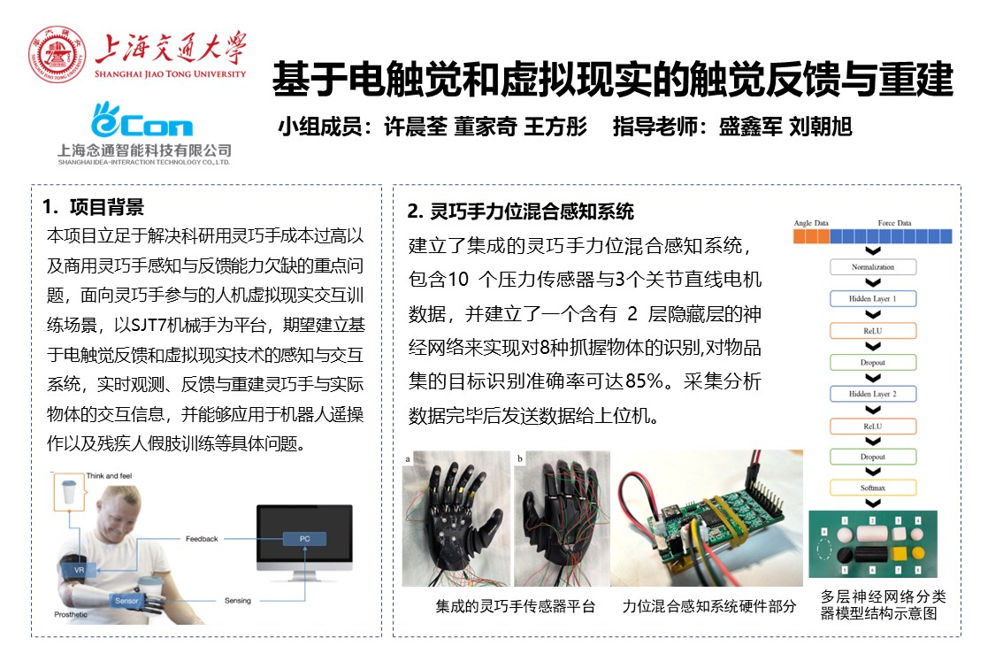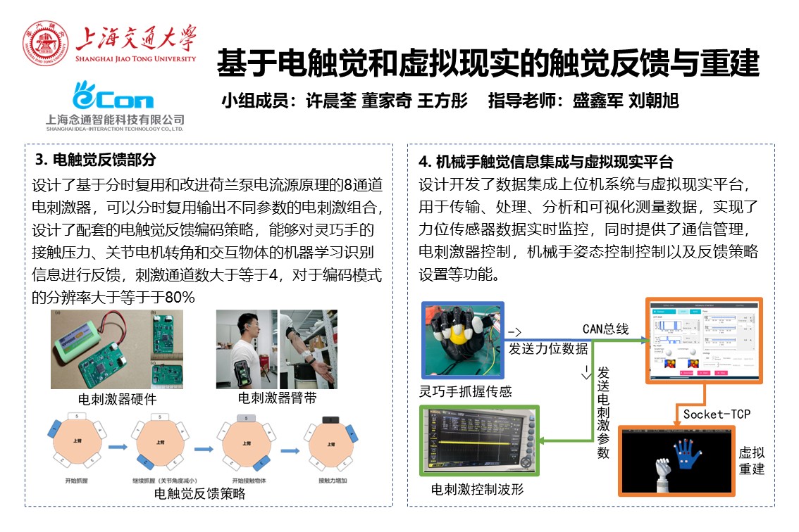 本项目旨在实现以下目标:拓展机械灵巧手的前端力位感知能力,实现对抓握过程中的接触力、关节角度以及交互物体信息进行感知;电触觉反馈模块能够对于灵巧手的前端传感器数据以及用户的控制意图,通过适当的电触觉反馈编码策略实现触觉信息的反馈,传递人机交互过程中的力触觉和本体感;设计用于与灵巧手交互的虚拟现实平台和上位机模块,虚拟现实平台可以实现对灵巧手的抓握过程进行重建,上位机界面可以显示灵巧手触觉信息和电触觉反馈策略控制。
