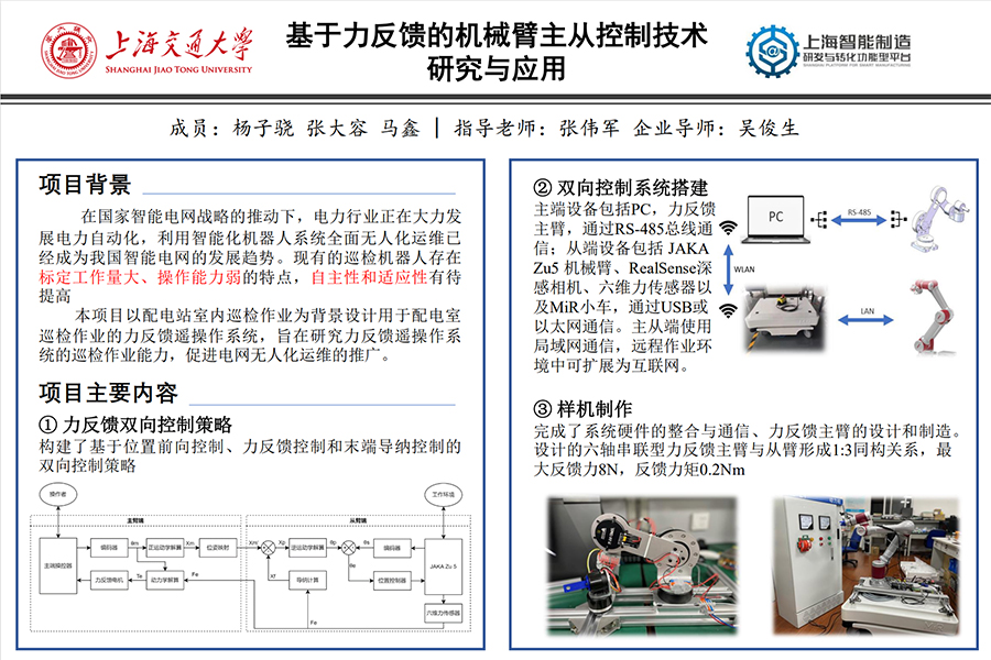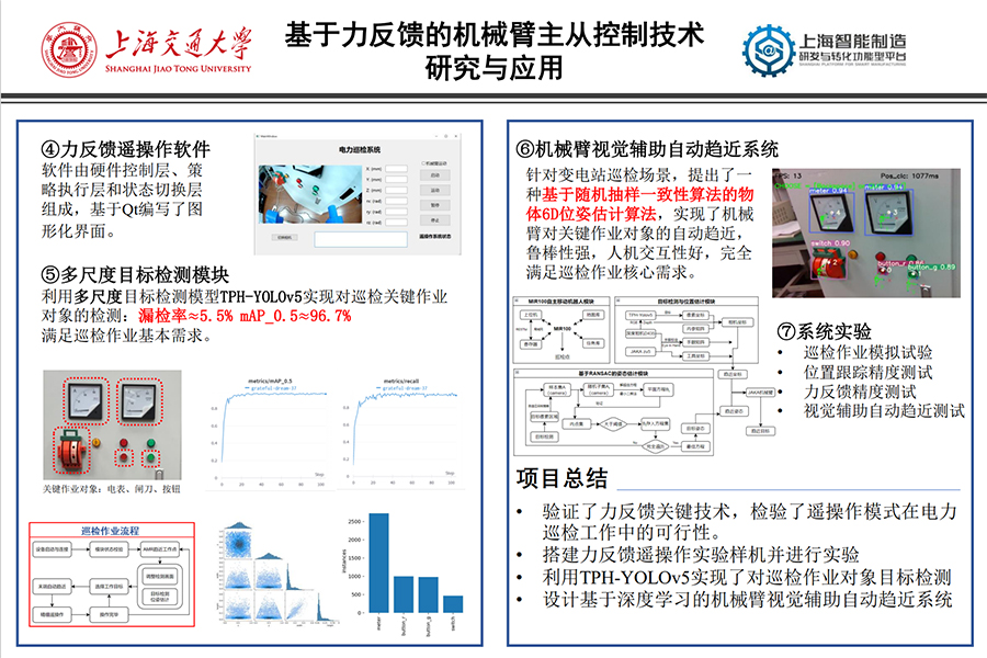 初步完成变电站力反馈遥操作巡检机器人系统的设计与制作,其中包括:搭建了同构串联型六自由度遥操作平台;制定并实现了主从双向控制控制策略;编写了带人机交互界面的遥操作软件;完成了遥操作平台典型巡检作业任务试验;设计了基于深度学习的目标检测系统与基于深度相机的机械臂自动趋近系统,实现了对变电站典型作业对象的目标检测以及机械臂末端对目标作业对象的自动趋近;设计了AMR巡检控制系统,实现了AMR对指定巡检点位的自动趋近。