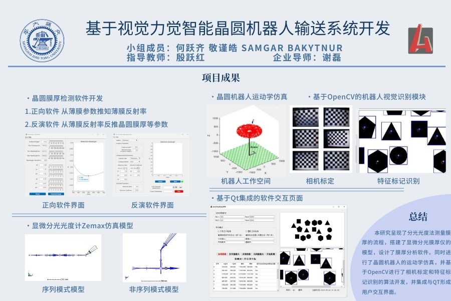 晶圆⽣产⼯艺中常常使⽤的膜包括⼆氧化硅等钝化膜、光刻㬵形成的膜等。基于分光光度法确认这些膜的厚度从⽽精确控制后续加⼯⼯艺的起点与终点。主要包括:设计显微分光光度计的仿真模型、设计膜厚检测软件等。同时,通过对机械臂与晶圆状态进行视觉识别,实现对机械手与晶圆片在各个工位转换时的状态监测,主要包括晶圆是否抓取、角度是否符合预期值、机械臂的运动状态等。