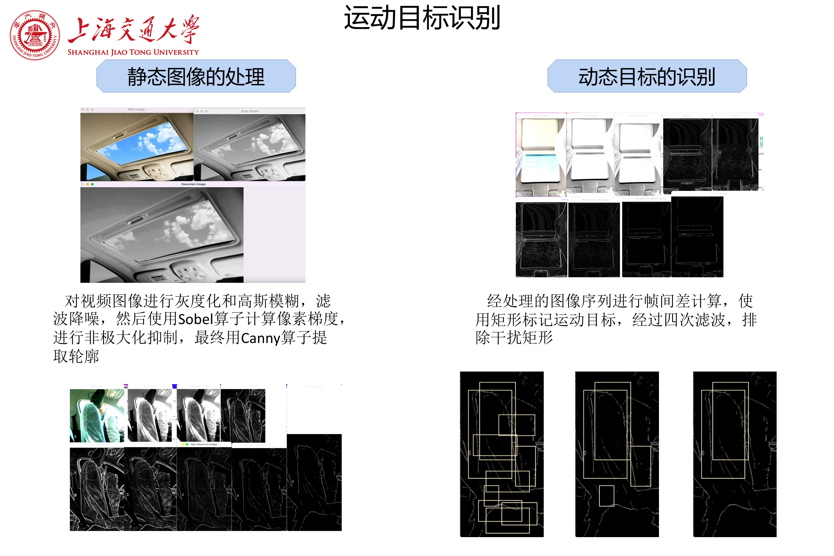 项目实现了使用安卓平板的程序对天窗和座椅的运动进行动态识别的功能,能够识别天窗和座椅的位置、运动情况,并进而判断天窗的运动情况是否正常,随后向用户输出一份检测报告。项目也实现了预期的语音识别功能,可以识别使用者的语音输入指令,并且能够据此发出指令控制天窗和遮阳板的运动。