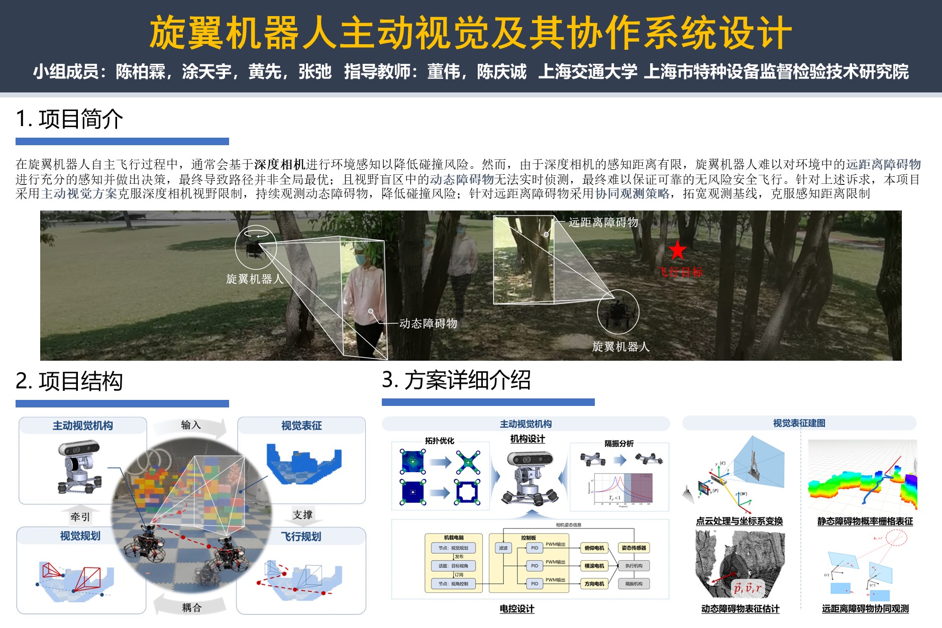 针对上述诉求,本项目设计多机协同主动视觉协同观测方法估计远距离障碍物并计算任务前瞻轨迹,并构建多目标泛化距离模型优化旋翼机器人的轨迹,降低旋翼机器人执行远距离任务的飞行时间;设计主动视觉机构控制相机旋转,利用拓扑优化与模态分析提升机构的轻便性与稳定性,利用点云与像素系语义信息构建动态障碍物包络,融合静态栅格地图与旋翼机器人协同感知语义地图对环境进行多模态表征,并设计调度算法规划主动视觉系统持续观测动态障碍物与潜在障碍物,基于多模态表征构建价值函数优化调度主动视觉机构,以提升旋翼机器人飞行穿越动态障碍物的安全性。