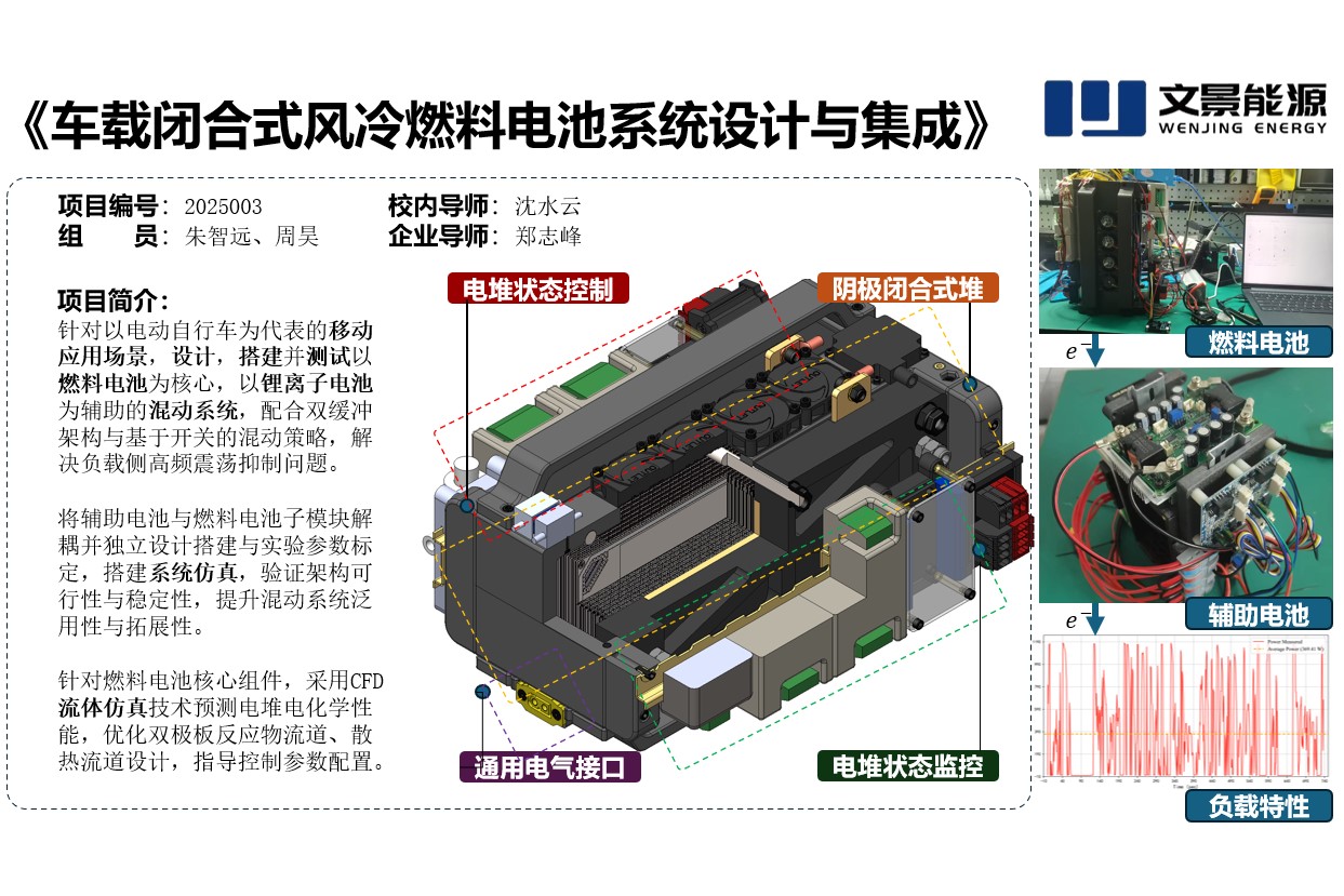 项目搭建500W燃料电池电堆系统一台,工作状态稳定可控;搭建1000W辅助电池系统一台,部署混动策略响应特性优异,能量转化效率高;收集电动自行车负载特性数据、子系统工作特性参数,完成混动系统仿真模型搭建与架构验证。