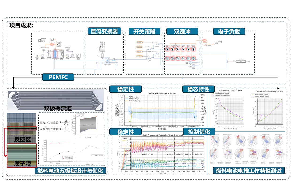 针对燃料电池核心组件双极板与膜电极,采用CFD仿真技术指导结构参数优化,显著提升温度、压力场均匀性,保障大功率拉载下的系统稳定性;针对燃料电池控制稳定工作状态点的选取,完成阴极计量比、阳极计量比、阴极进气湿度敏感性测试,指导控制参数优化。