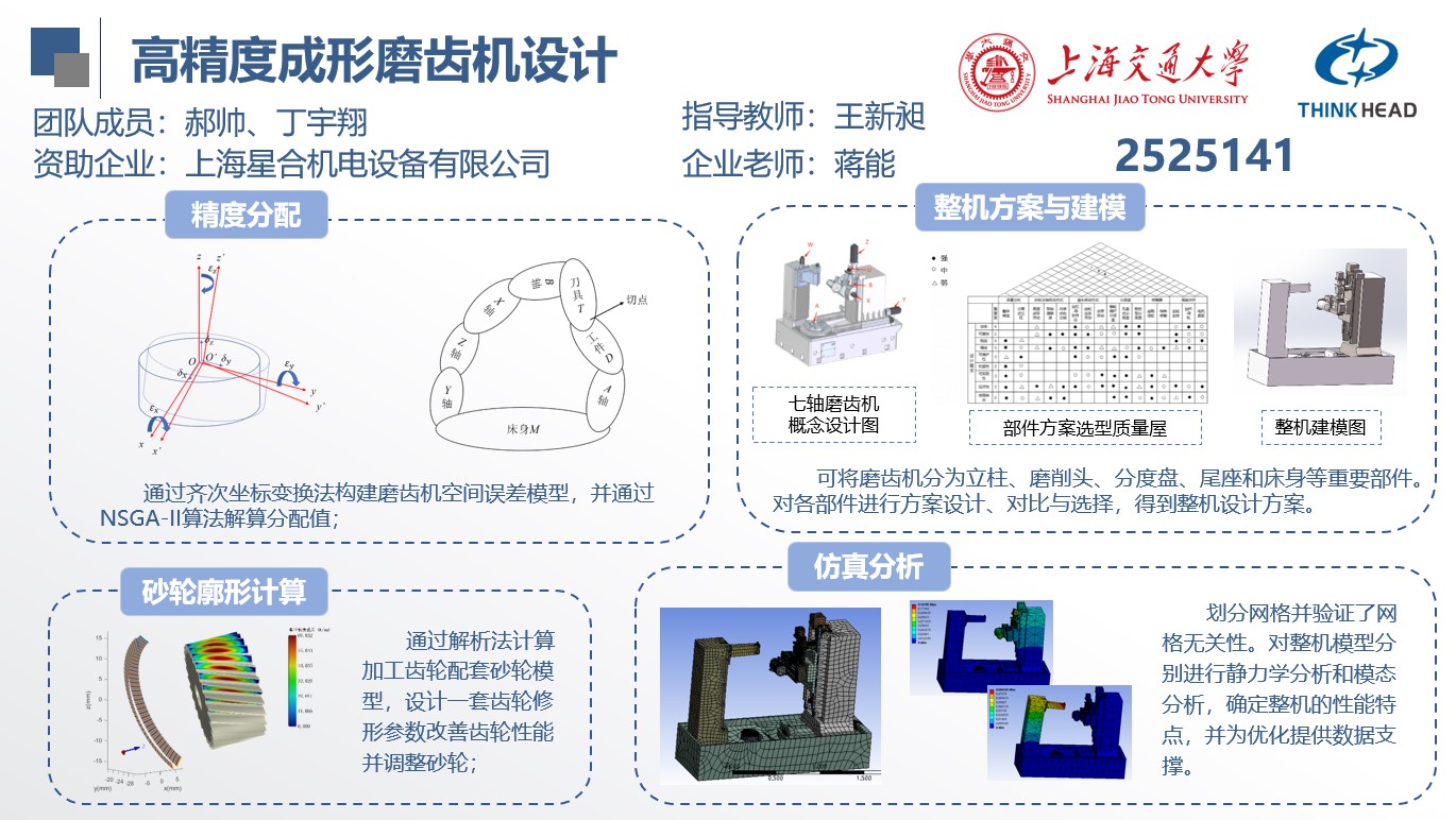 主要目标分为两部分,由郝帅和丁宇翔两名同学完成。郝帅同学的目标为完成高精度成形磨齿机的空间误差模型构建,并以此为基础设计精度分配算法完成对机床的精度分配;研究磨削齿轮盘形刀具轮廓设计方法,根据一典型型号齿轮加工设计一配套砂轮并完成廓形计算,并根据齿轮修形需求对其进行调整。丁宇翔同学的目标为完成高精度成形磨齿机大型结构件的结构和强度设计以及驱动及精密传动部件的选型和结构设计;基于结构件选型设计,完成高精度成型磨齿机的整机装配设计。