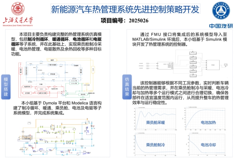 基于项目现状,本项目拟开展新能源汽车热管理系统先进控制策略的开发研究。项目要求针对一特定的新能源汽车热管理系统,使用modelica语言和Dymola仿真平台建立制冷剂循环系统、暖通系统、电驱系统、电池系统仿真模型,并建立八通阀模型将四个子系统集成为整车热管理系统,在此基础上在Matlab中建立热管理控制器及控制逻辑,选择合理的控制方法实现乘员舱系统、电池系统、电驱系统的温度控制,并开发单系统以及多系统集成的典型工作模式。
