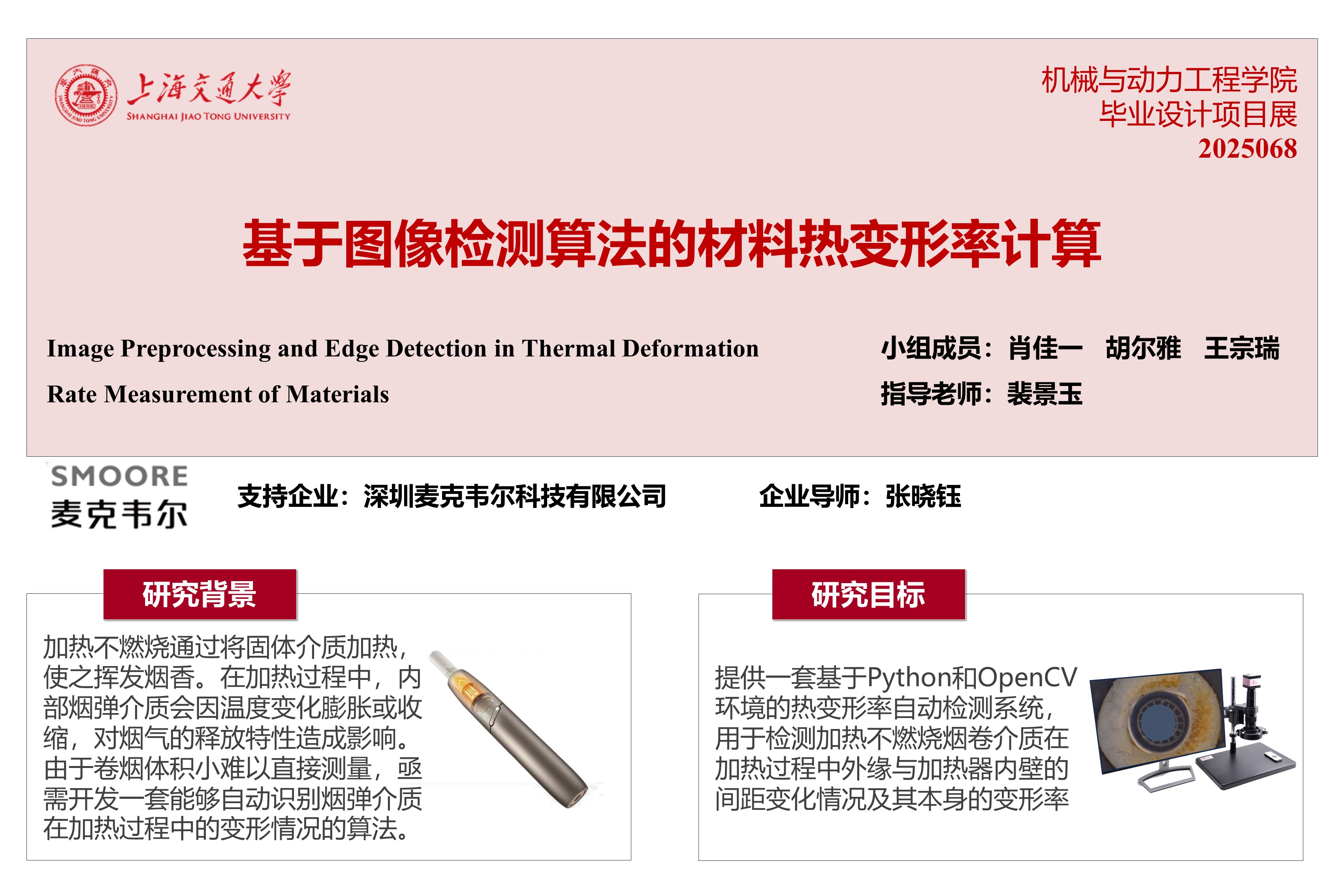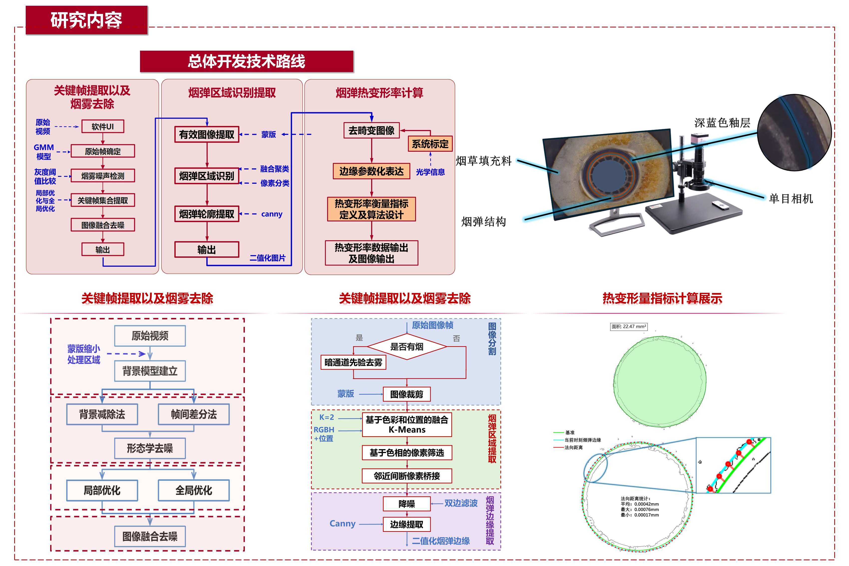 本项目旨在提供一套基于Python的OpenCV环境的热变形率自动检测系统,用于检测加热不燃烧烟卷介质在加热过程中外缘与加热器内壁的间距变化情况及其本身的变形率。需输入介质加热变化视频,输出其变形率和间隙等数据随时间变化的曲线。生产方需求包括:能精准识别并去除烟雾、降低对拍摄设备的要求、提高对介质变形情况的识别精度等。