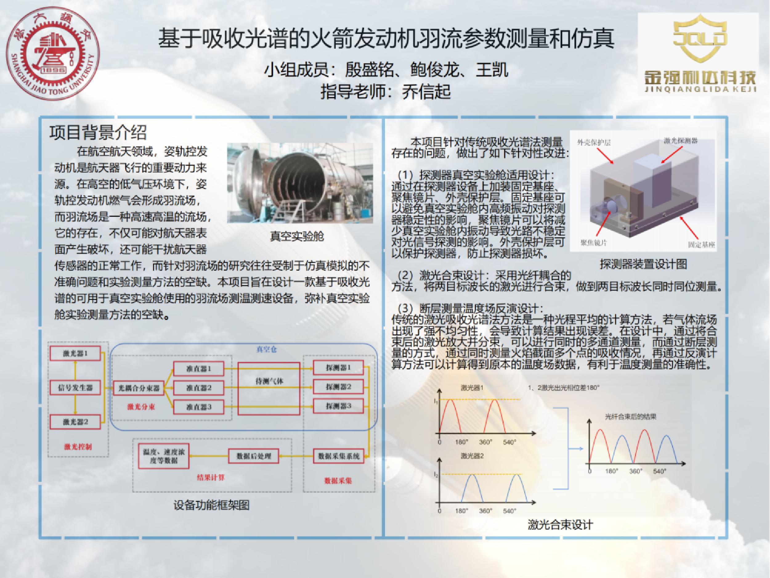 在航天领域,姿轨控发动机是航天飞行器的重要动力来源。在高空的低气压环境下,姿轨控发动机燃气会形成羽流场,而羽流场是一种高速高温的流场,它的存在不仅可能对航天器表面进行破坏,还可能干扰着航天器传感器的正常工作。而针对羽流场的研究,往往受制于仿真模拟的不准确问题和实验测量方法的空缺。本项目旨在设计一款基于吸收光谱的可用于真空实验舱使用的发动机羽流场测量设备,弥补了真空实验舱内实验测量方法的空缺。