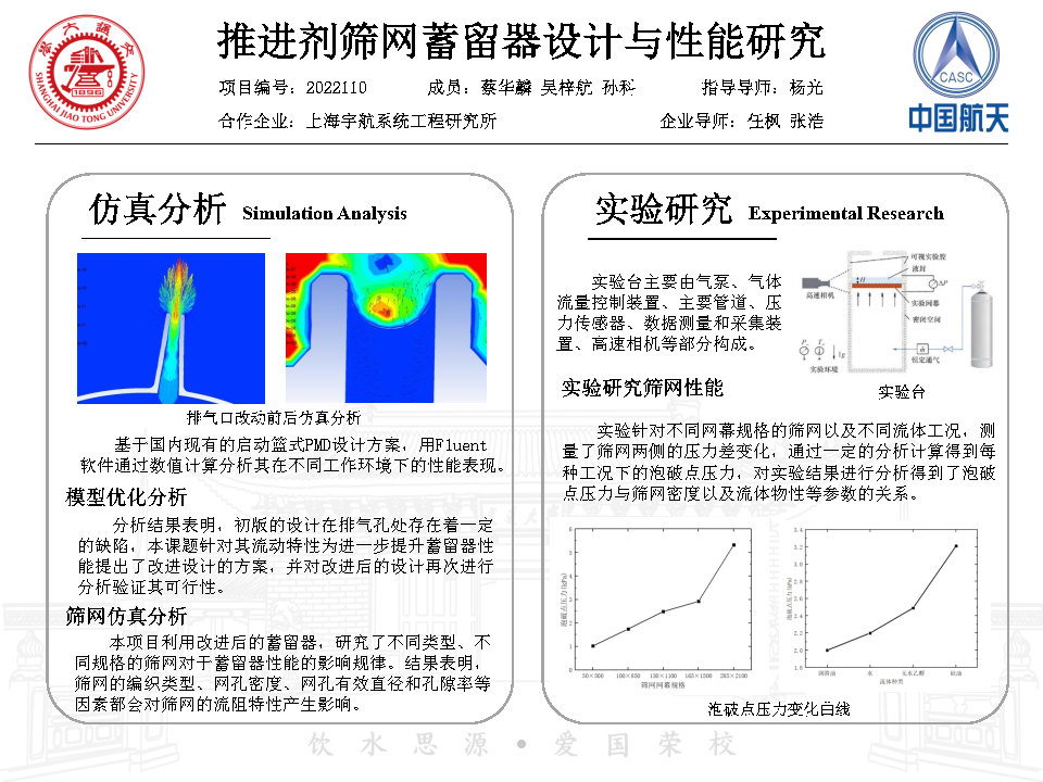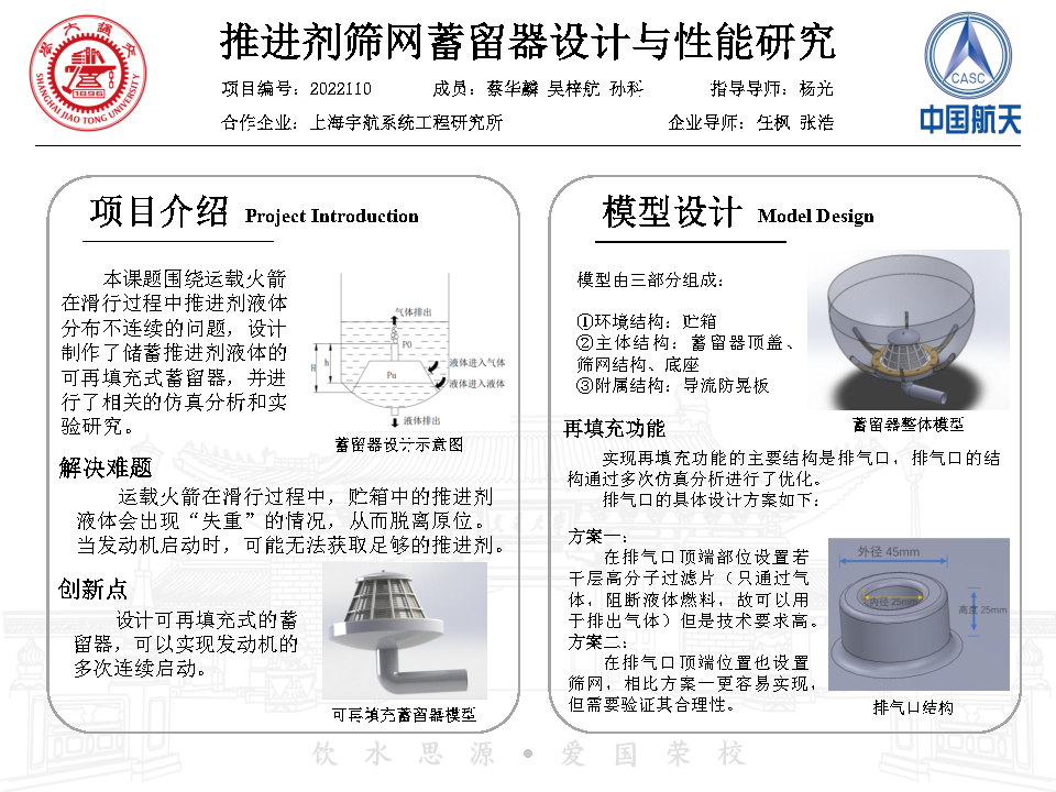 本课题围绕运载火箭在滑行过程中推进剂液体分布不连续的问题,需要设计完成能够储蓄推进剂液体的可再填充式蓄留器,并进行相关的仿真分析和实验研究。