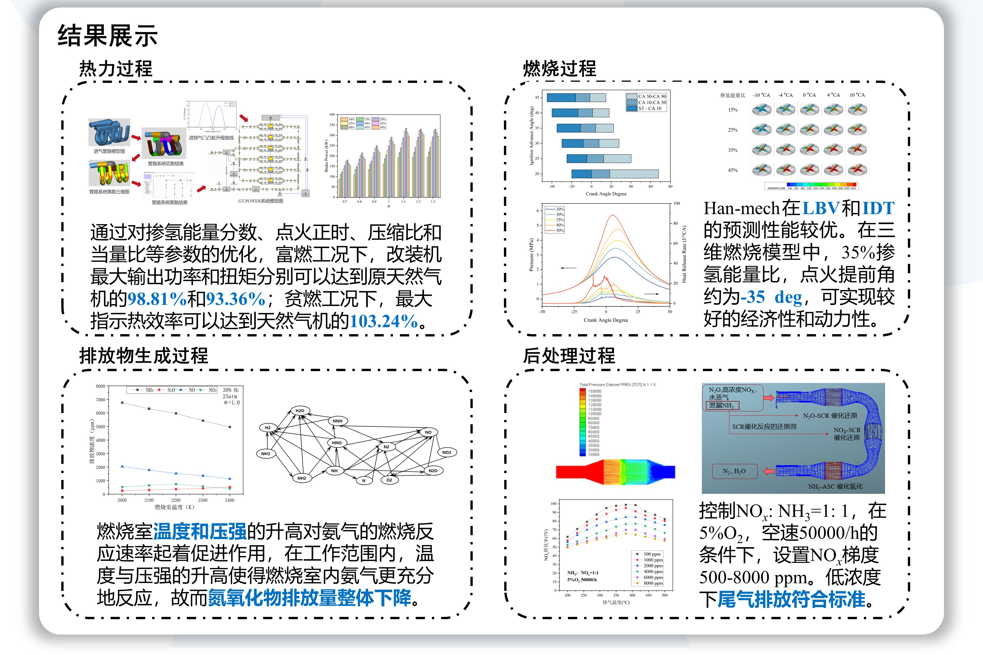在不同工况下,探究多关键技术参数对氨氢发动机的输出性能、燃烧特性和经济性的影响规律,并基于此规律提出优化策略,使之实现与天然气发动机相当的性能水准。此外探究氨氢混合燃料燃烧的重要化学反应机理模型,探究关键排放物,如NOx、N2O、NH3等的生成路径及关键影响因素,并设计高效的后处理净化技术,通过优化发动机与设计新型燃烧策略等措施解决氨氢发动机燃烧不稳定、NOx排放高、N2O排放高以及NH3泄漏严重等问题。