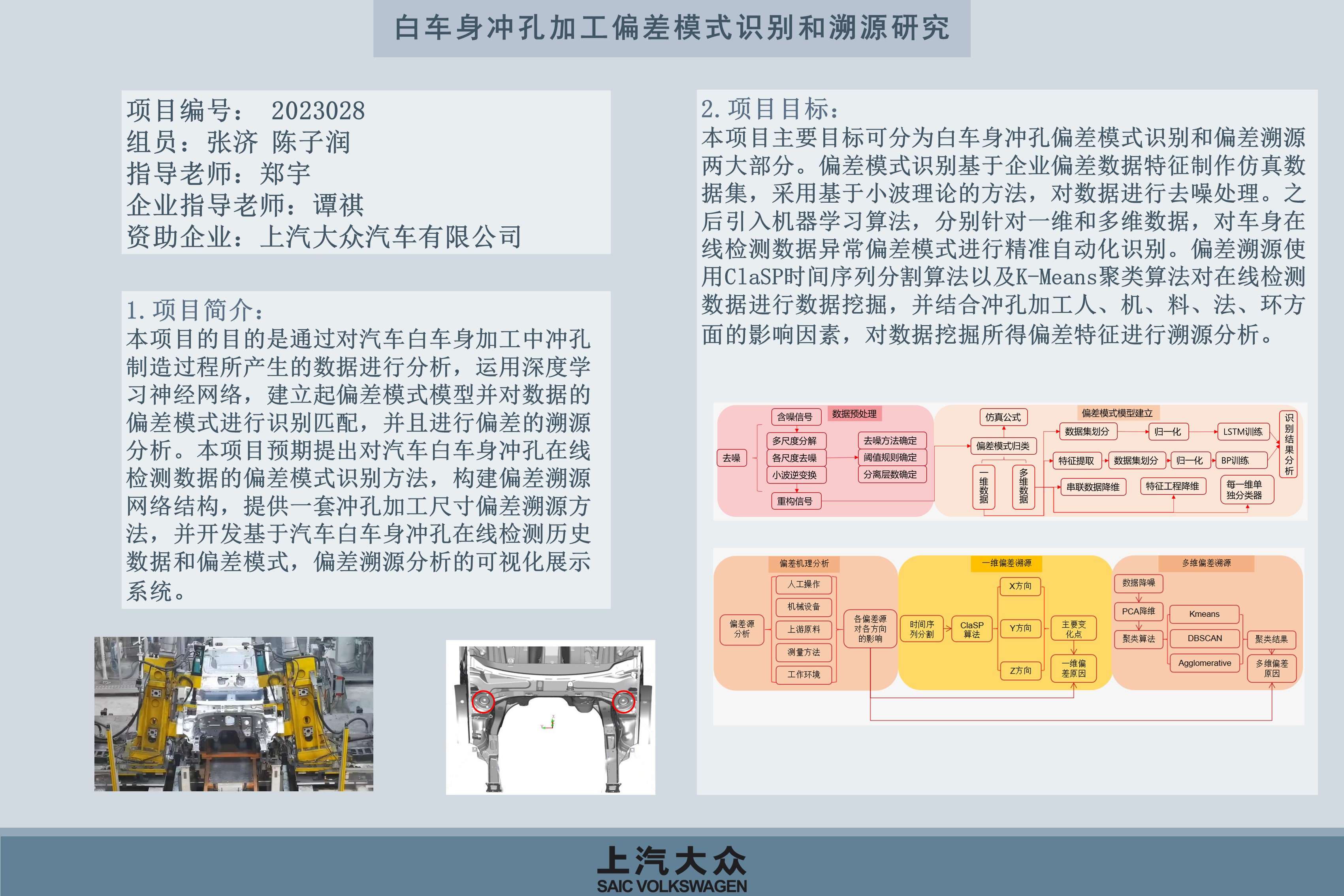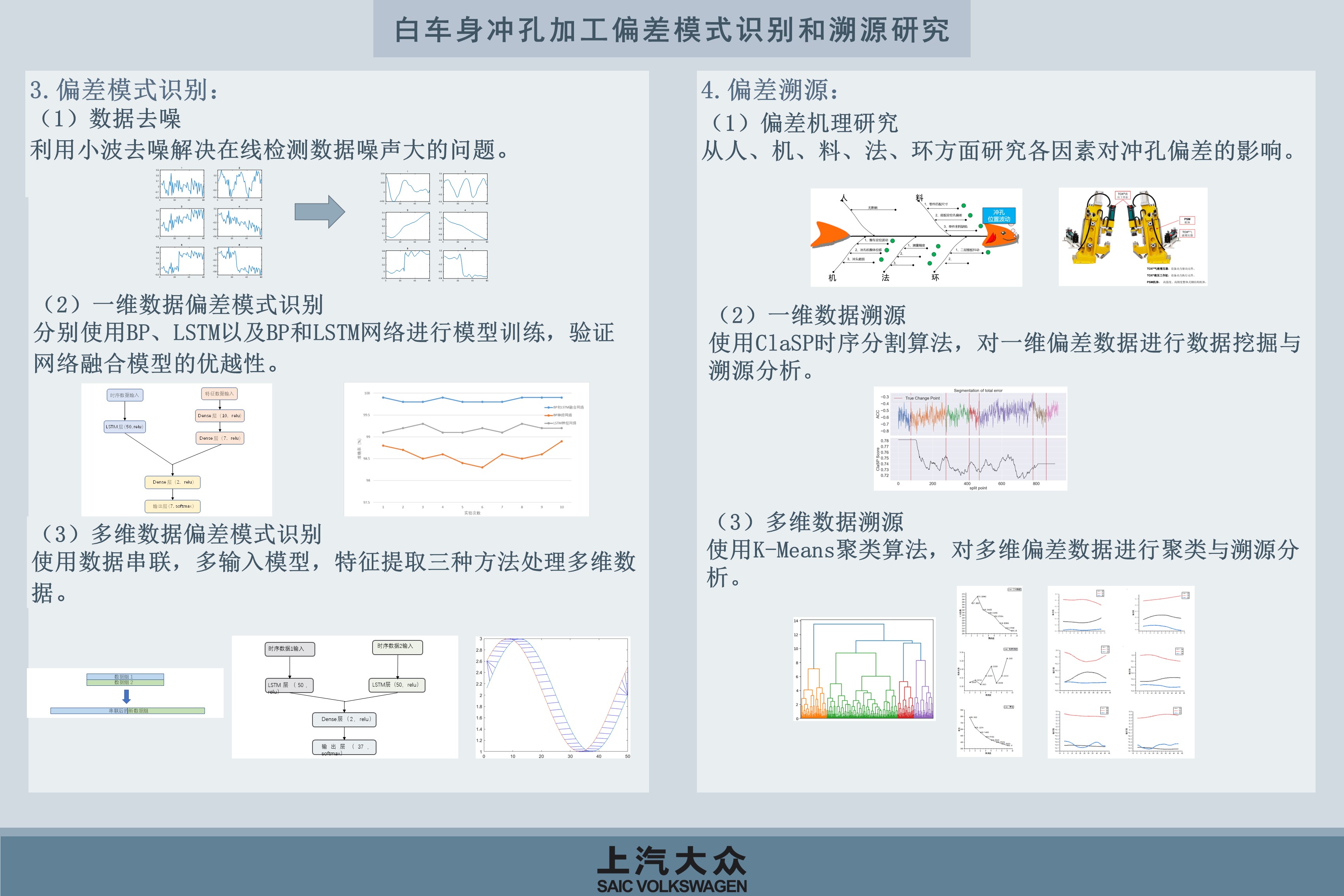 本项目主要目标可分为白车身冲孔偏差模式识别和偏差溯源两大部分。偏差模式识别基于企业偏差数据特征制作仿真数据集,采用基于小波理论的方法,对数据进行去噪处理。之后引入机器学习算法,分别针对一维和多维数据,对车身在线检测数据异常偏差模式进行精准自动化识别。偏差溯源使用ClaSP时间序列分割算法以及K-Means聚类算法对在线检测数据进行数据挖掘,并结合冲孔加工人、机、料、法、环方面的影响因素,对数据挖掘所得偏差特征进行溯源分析。