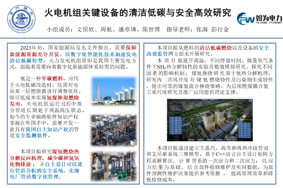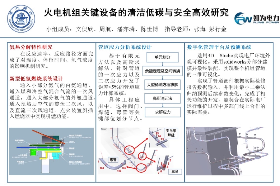 本项目以降低火力发电碳排放、完成发电厂数字化安全监管为研究主题,拟通过对煤氨掺混热分解机理进行研究,并且根据该热分解机理设计新型燃烧器以降低火力发电碳排放,并且为针对燃烧不稳定以及产生的高温高压等安全隐患,进行管道应力安全系统的开发以及数字化管理系统的开发,以达到数字化智能化管理的目标。