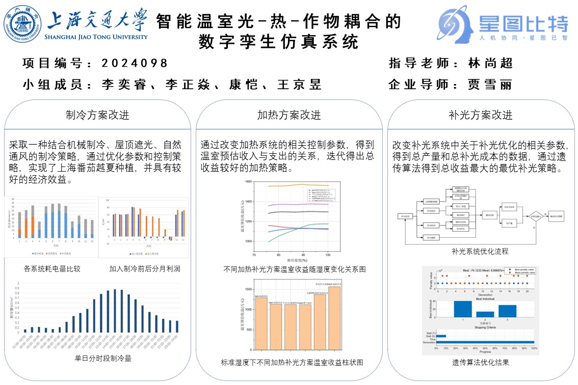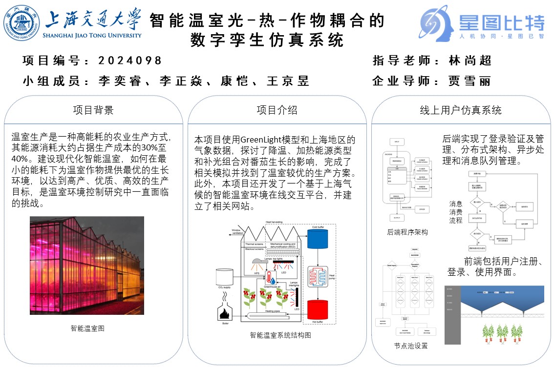 本项目利用荷兰模型GreenLight,使用上海地区典型气象年数据,根据番茄从定植到拉秧整个生长季对温度、湿度、光照和CO2浓度的不同需求,探究了降温制冷、加热能源类型和补光组合三个方面来对温室番茄的生长情况的影响,完成了相关模拟,并对所选方案进行了优化,寻找到较优方案。以外,本项目还开发了一套基于上海气候条件的智能温室环境线上用户交互平台,并建立了相关网站。
