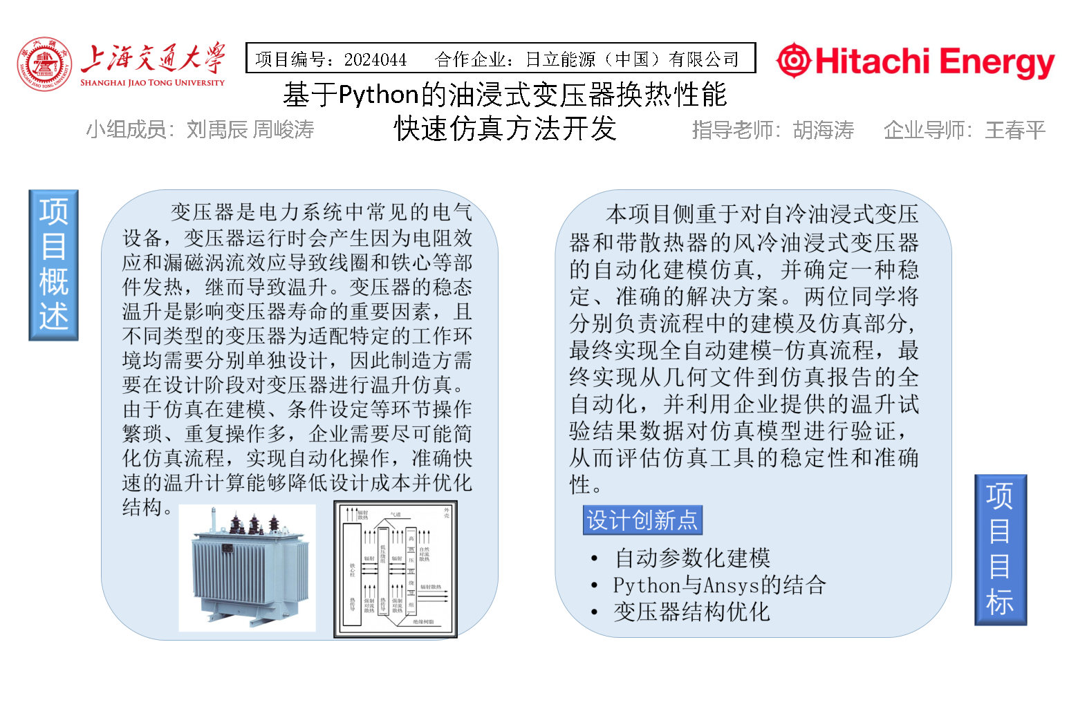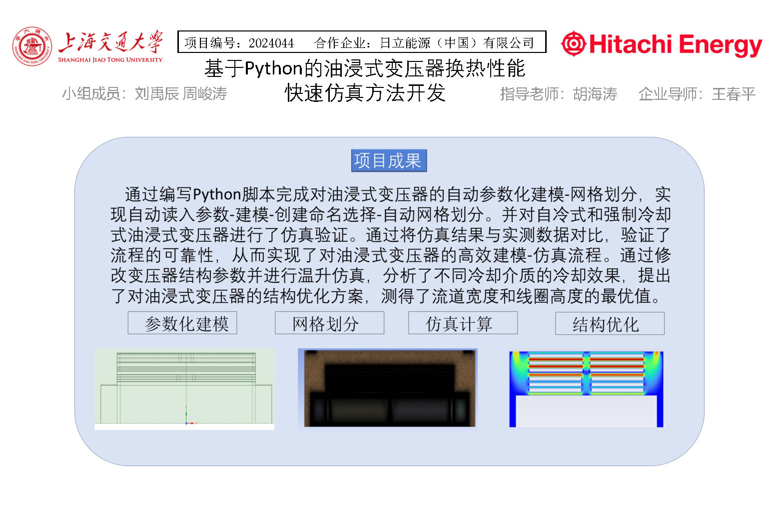 本项目侧重于对自冷油浸式变压器和带散热器的风冷油浸式变压器的自动化建模仿真, 并确定一种稳定、准确的解决方案。两位同学将分别负责流程中的建模及仿真部分,最终实现全自动建模-仿真流程,最终实现从几何文件到仿真报告的全自动化,并利用企业提供的温升试验结果数据对仿真模型进行验证,从而评估仿真工具的稳定性和准确性。最后通过对不同结构的变压器进行仿真,实现对变压器结构的优化。