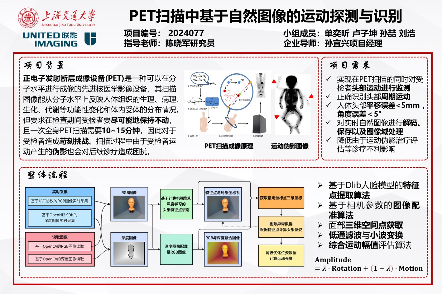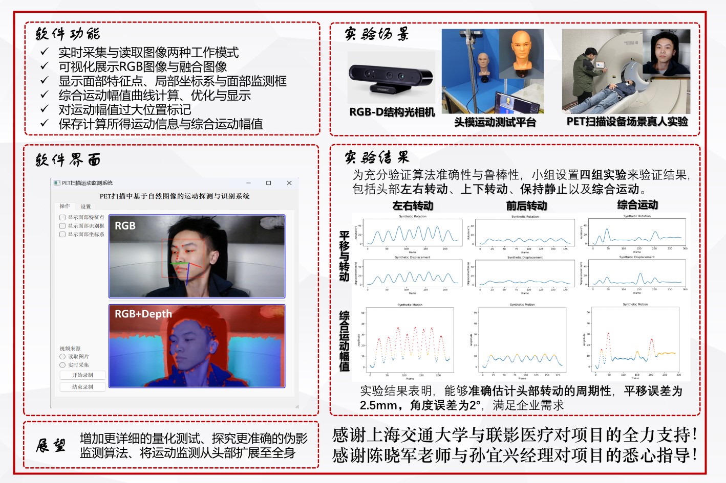 本项目中,我们将实现一种无标记的PET扫描运动探测识别系统。小组将从结构、硬件、软件、算法等方面对基于2D摄像头自然图像的运动监控与检测做工程化实现,完成对PET受检者的运动监控与检测,并能够在联影的PET/CT上进行部署,从而实现简洁高效的PET扫描过程中的运动甄别。系统能够正确识别头部周期运动,同时在误差方面要求人体头部平移误差小于5mm ,角度误差小于5°。