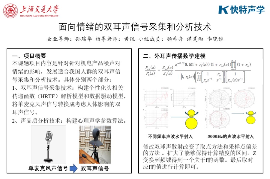 本项目针对机电产品噪声对情绪的影响,发展适合我国人群的双耳声信号采集和分析技术。首先,发展双耳声信号采集技术,我们将发展获取个性化头相关传递函数(HRTF)的方法,分别有计算HRTF的解析模型和数据驱动模型,将单麦克风声信号转换成考虑人体尺寸参数影响的双耳声信号。其次是发展声品质分析技术,我们将构建心理声学参数算法,以预测反应人们对声音的主观感受。