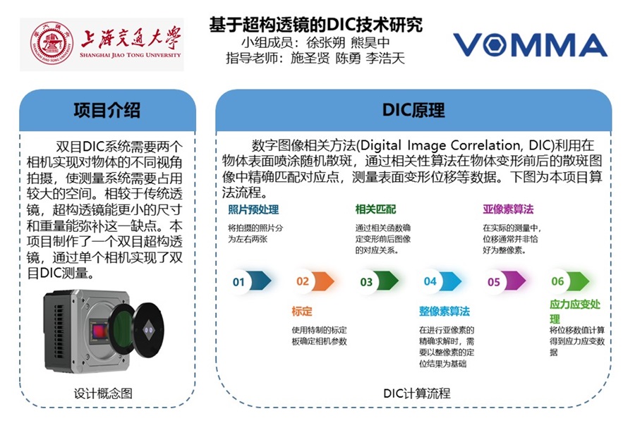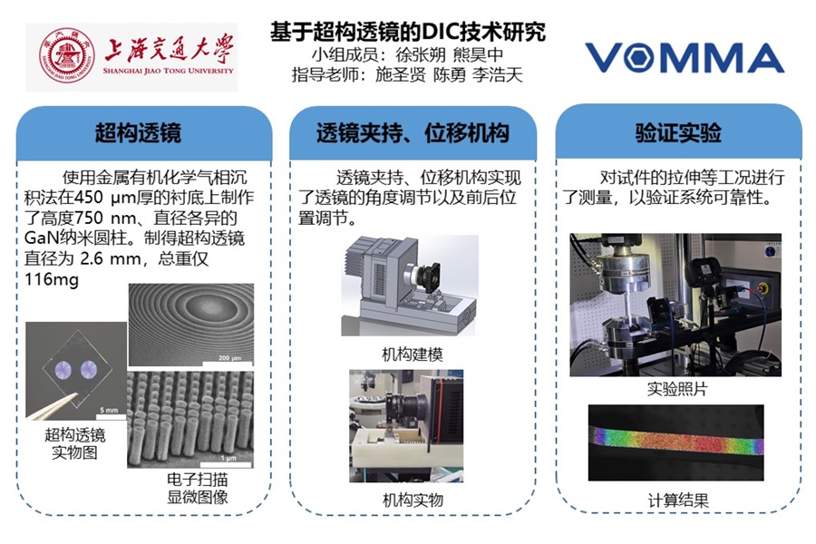 超构透镜作为一种新兴的光学技术,近年来发展迅速。超构透镜具有高分辨率、小尺寸和轻量化等优点。DIC技术是材料力学领域极具生命力的光学测量方法之一,为应变测量提供了低成本、高精度和高稳定性的实验手段。双目DIC系统需要两个相机实现对物体的不同视角拍摄,使测量系统需要占用较大的空间。相较于传统透镜,超构透镜能更小的尺寸和重量能弥补这一缺点。本项目制作了一个双目超构透镜,通过单个相机实现了双目DIC测量。