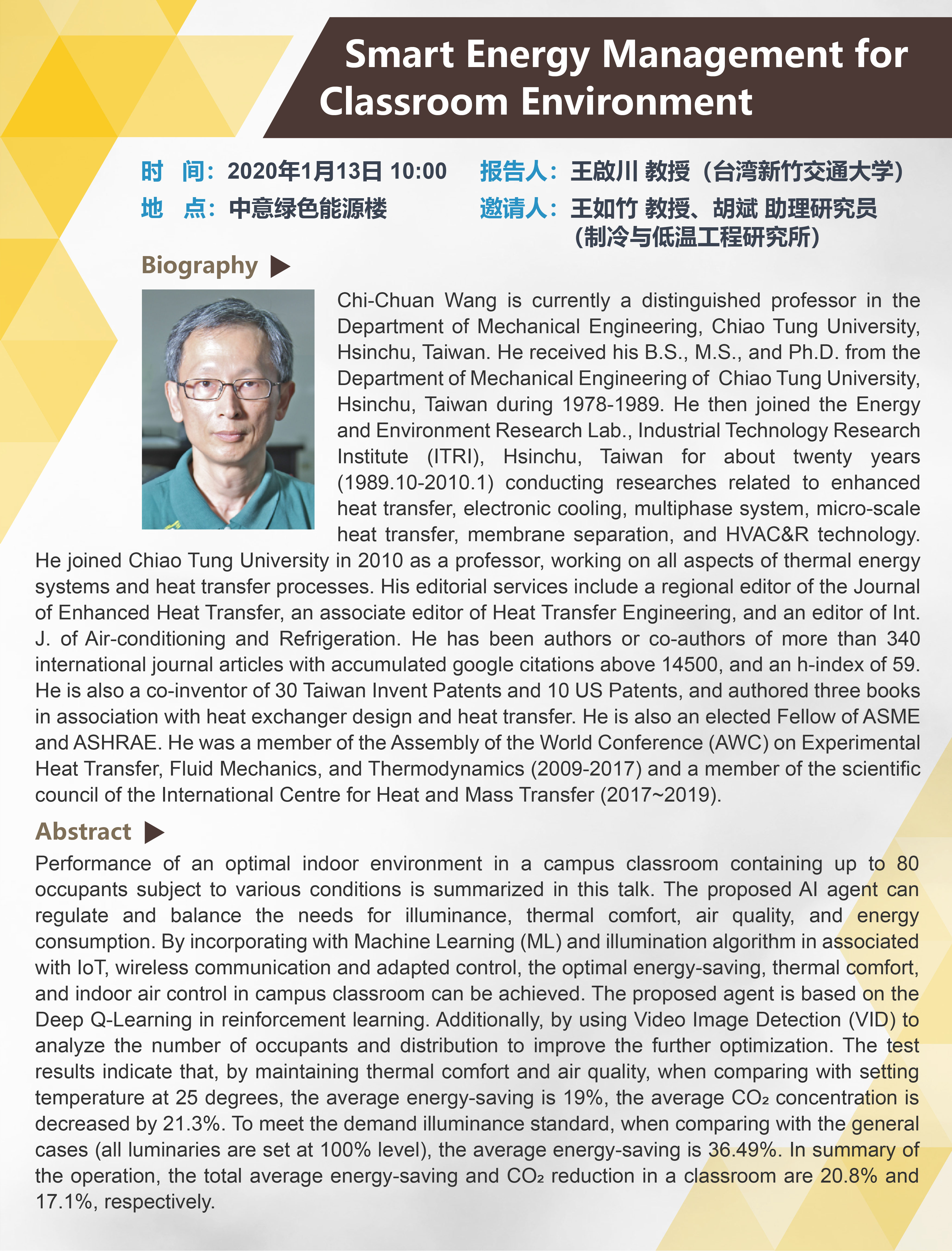 Chi-Chuan Wang is currently a distinguished professor in the Department of Mechanical Engineering, Chiao Tung University, Hsinchu, Taiwan. He received his B.S., M.S., and Ph.D. from the Department of Mechanical Engineering of Chiao Tung University, Hsinchu, Taiwan during 1978-1989. He then joined the Energy and Environment Research Lab., Industrial Technology Research Institute (ITRI), Hsinchu, Taiwan for about twenty years (1989.10-2010.1) conducting researches related to enhanced heat transfer, electronic cooling, multiphase system, micro-scale heat transfer, membrane separation, and HVAC&R technology. He joined Chiao Tung University in 2010 as a professor, working on all aspects of thermal energy systems and heat transfer processes. His editorial services include a regional editor of the Journal of Enhanced Heat Transfer, an associate editor of Heat Transfer Engineering, and an editor of Int. J. of Air-conditioning and Refrigeration. He has been authors or co-authors of more than 340 international journal articles with accumulated google citations above 14500, and an h-index of 59. He is also a co-inventor of 30 Taiwan Invent Patents and 10 US Patents, and authored three books in association with heat exchanger design and heat transfer. He is also an elected Fellow of ASME and ASHRAE. He was a member of the Assembly of the World Conference (AWC) on Experimental Heat Transfer, Fluid Mechanics, and Thermodynamics (2009-2017) and a member of the scientific council of the International Centre for Heat and Mass Transfer (2017~2019).