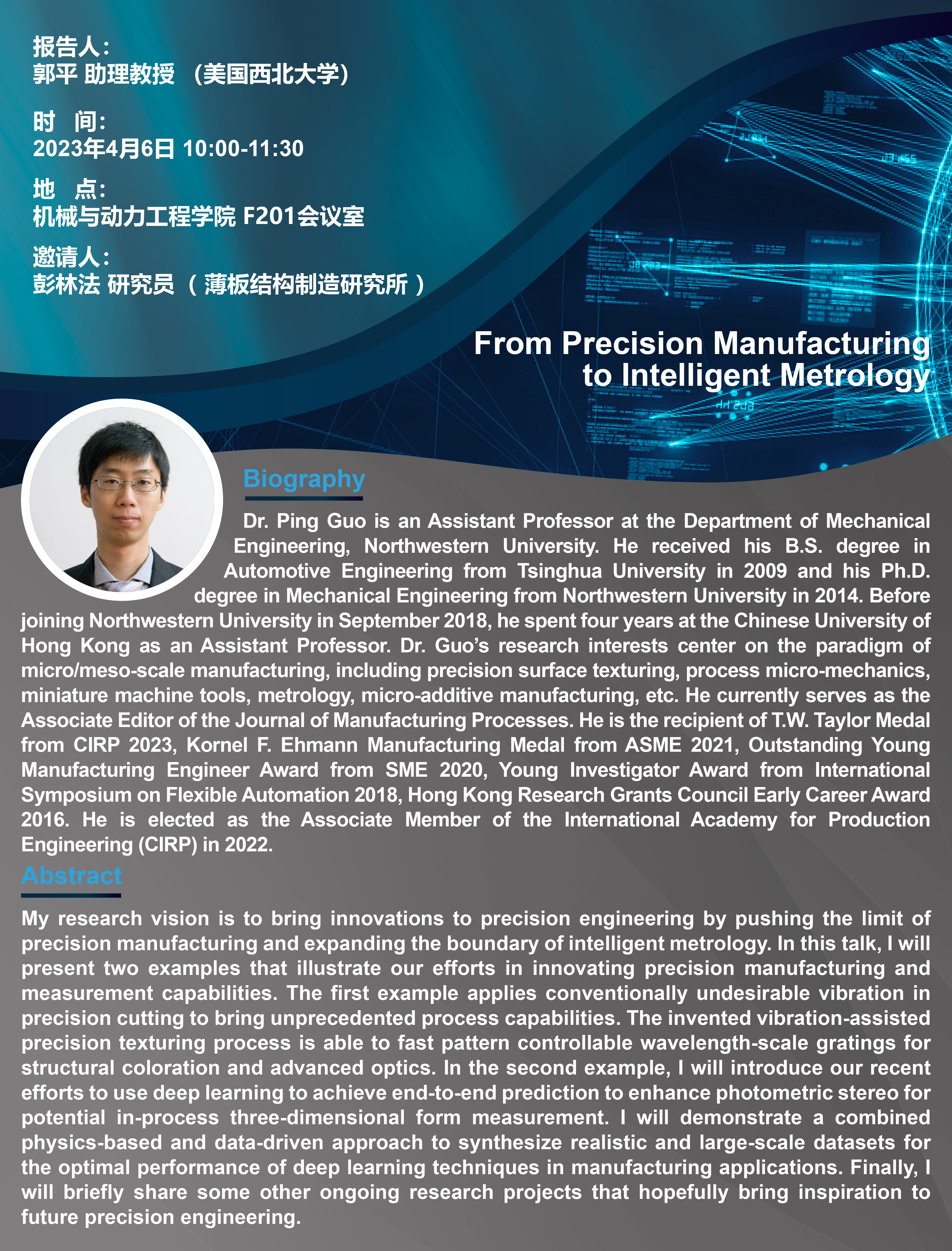 Dr. Ping Guo is an Assistant Professor at the Department of Mechanical Engineering, Northwestern University. He received his B.S.degree in Automotive Engineering from Tsinghua University in 2009 and his Ph.D. degree in Mechanical Engineering from Northwestern University in 2014. Before joining Northwestern University in September 2018, he spent four years at the Chinese University of Hong Kong as an Assistant Professor. Dr. Guo’s research interests center on the paradigm of micro/meso-scale manufacturing, including precision surface texturing, process micro-mechanics, miniature machine tools, metrology, micro-additive manufacturing, etc. He currently serves as the Associate Editor of the Journal of Manufacturing Processes. He is the recipient of T.W. Taylor Medal from CIRP 2023, Kornel F. Ehmann Manufacturing Medal from ASME 2021, Outstanding Young Manufacturing Engineer Award from SME 2020, Young Investigator Award from International Symposium on Flexible Automation 2018, Hong Kong Research Grants Council Early Career Award 2016. He is elected as the Associate Member of the International Academy for Production Engineering (CIRP) in 2022.