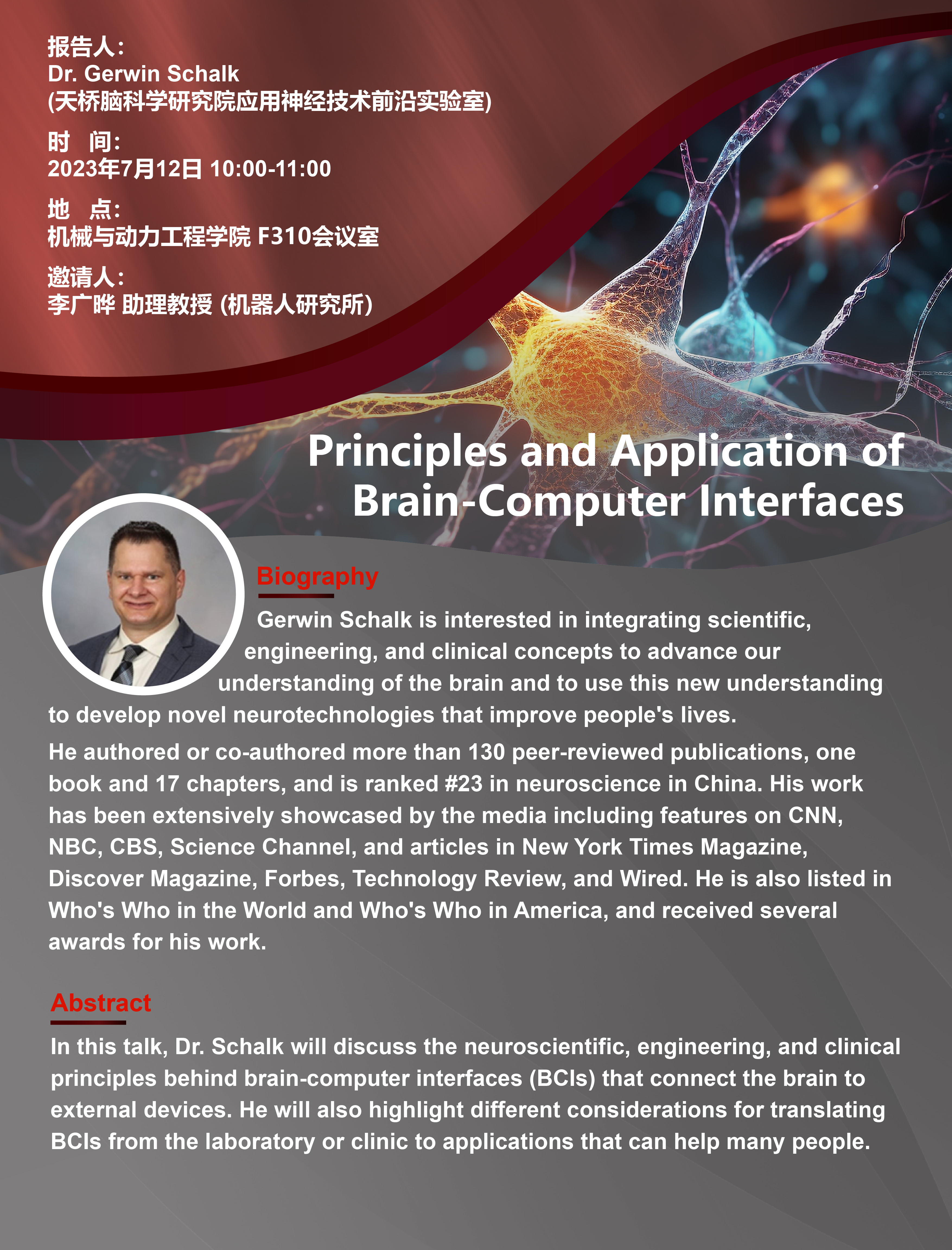 In this talk, Dr. Schalk will discuss the neuroscientific, engineering, and clinical principles behind brain-computer interfaces (BCIs) that connect the brain to external devices. He will also highlight different considerations for translating BCIs from the laboratory or clinic to applications that can help many people.