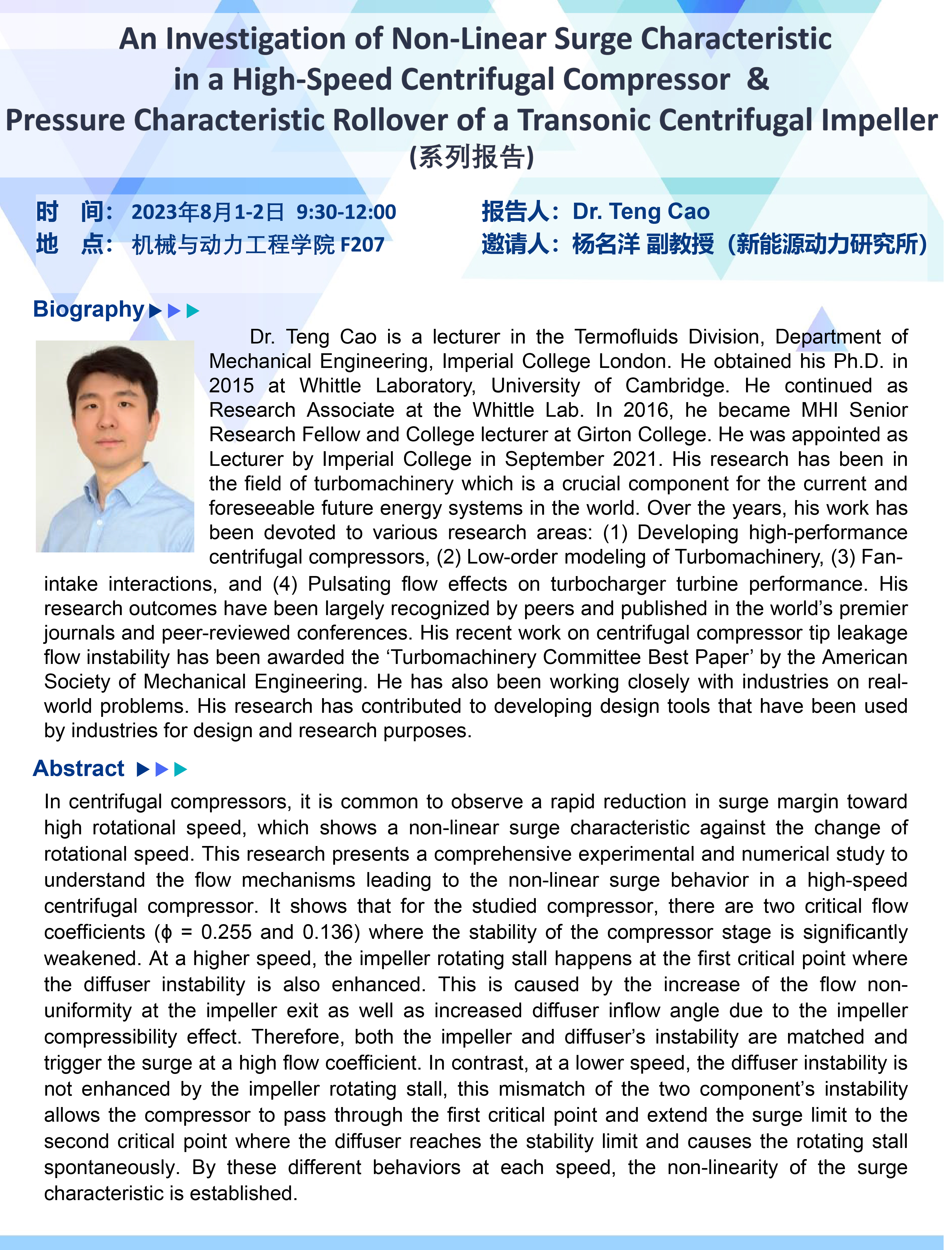 Dr. Teng Cao is a lecturer in the Termofluids Division, Department of Mechanical Engineering, Imperial College London. He obtained his Ph.D. in 2015 at Whittle Laboratory, University of Cambridge. He continued as Research Associate at the Whittle Lab. In 2016, he became MHI Senior Research Fellow and College lecturer at Girton College. He was appointed as Lecturer by Imperial College in September 2021. His research has been in the field of turbomachinery which is a crucial component for the current and foreseeable future energy systems in the world. Over the years, his work has been devoted to various research areas: (1) Developing high-performance centrifugal compressors, (2) Low-order modeling of Turbomachinery, (3) Fan-intake interactions, and (4) Pulsating flow effects on turbocharger turbine performance. His research outcomes have been largely recognized by peers and published in the world’s premier journals and peer-reviewed conferences. His recent work on centrifugal compressor tip leakage flow instability has been awarded the ‘Turbomachinery Committee Best Paper’ by the American Society of Mechanical Engineering. He has also been working closely with industries on real-world problems. His research has contributed to developing design tools that have been used by industries for design and research purposes.