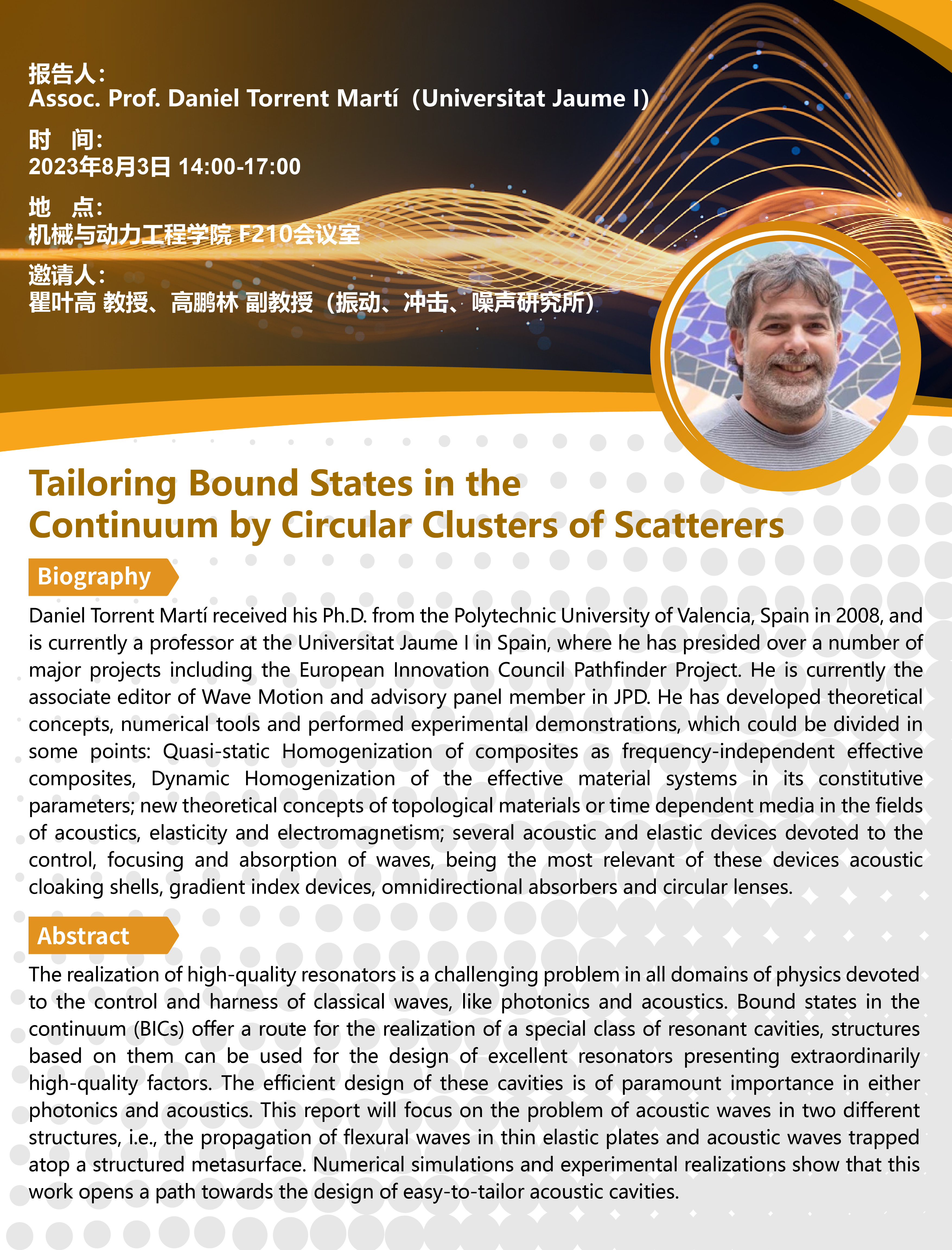 Daniel Torrent Martí received his Ph.D. from the Polytechnic University of Valencia, Spain in 2008, and is currently a professor at the Universitat Jaume I in Spain, where he has presided over a number of major projects including the European Innovation Council Pathfinder Project. He is currently the associate editor of Wave motion and advisory panel member in JPD. He has developed theoretical concepts, numerical tools and performed experimental demonstrations, which could be divided in some points: Quasi-static Homogenization of composites as frequency-independent effective composites, Dynamic Homogenization of the effective material systems in its constitutive parameters; new theoretical concepts of topological materials or time dependent media in the fields of acoustics, elasticity and electromagnetism; several acoustic and elastic devices devoted to the control, focusing and absorption of waves, being the most relevant of these devices acoustic cloaking shells, gradient index devices, omnidirectional absorbers and circular lenses.
