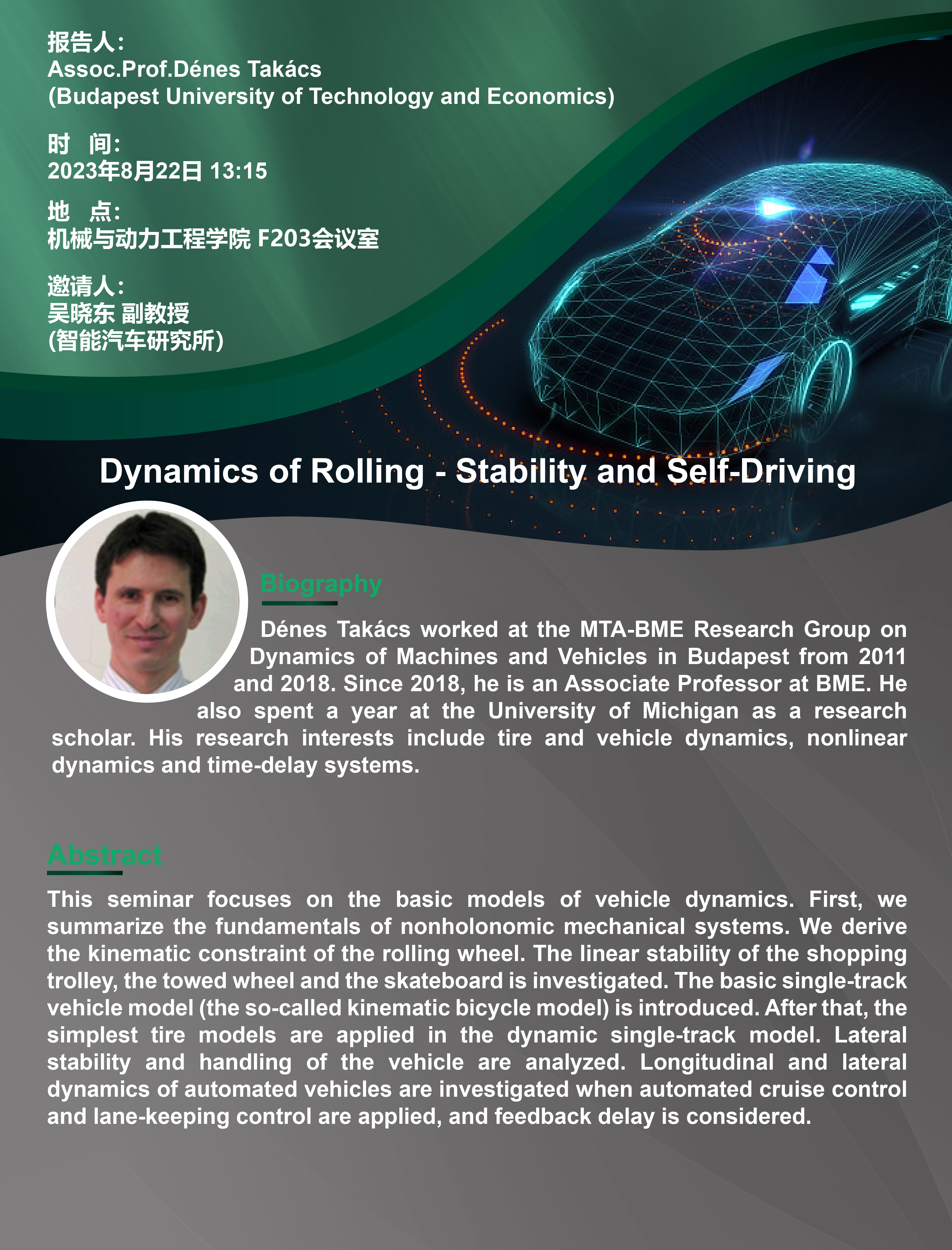 Dénes Takács worked at the MTA-BME Research Group on Dynamics of Machines and Vehicles in Budapest from 2011 and 2018. Since 2018, he is an Associate Professor at BME. He also spent a year at the University of Michigan as a research scholar. His research interests include tire and vehicle dynamics, nonlinear dynamics and time-delay systems.