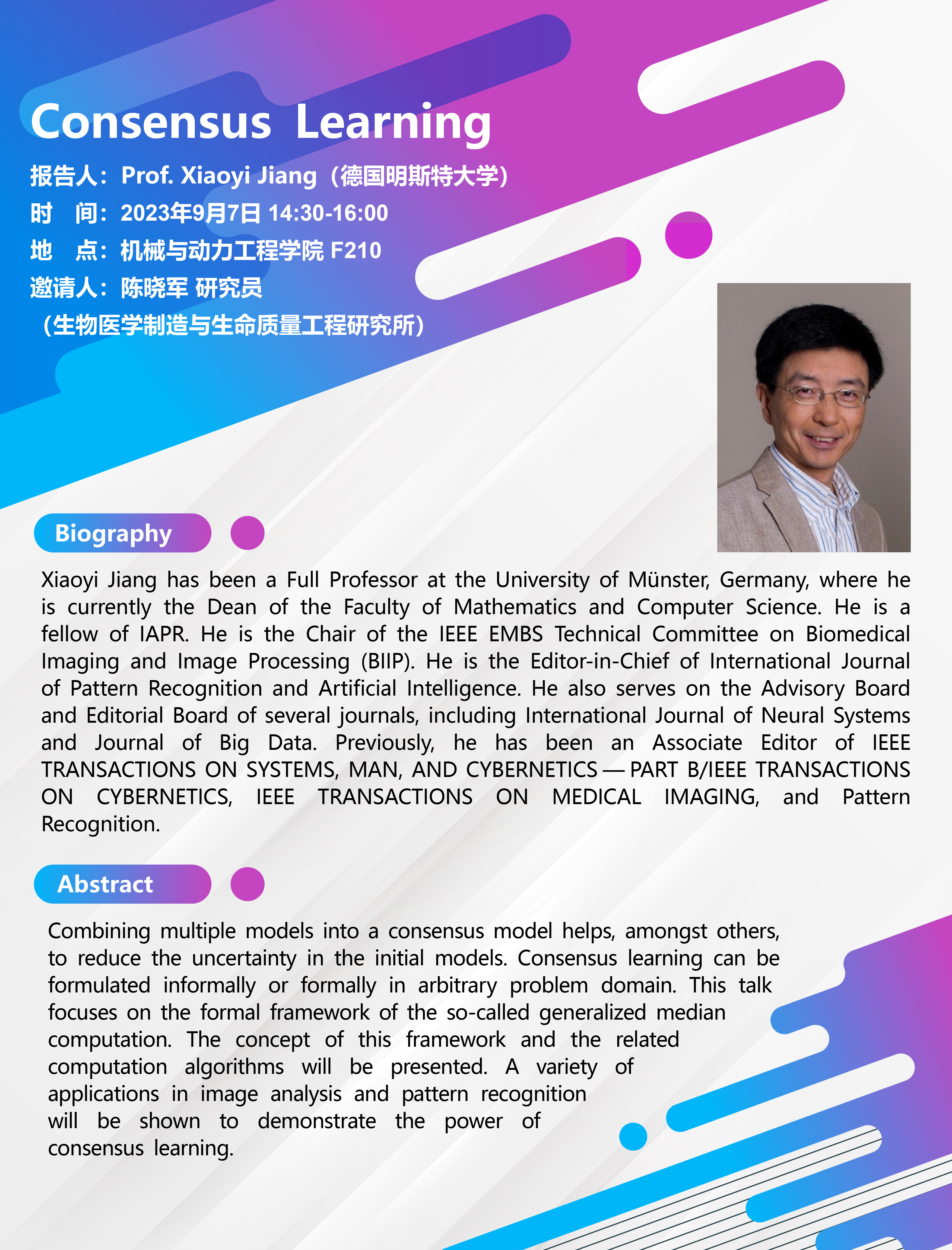 Xiaoyi Jiang has been a Full Professor at the University of Münster, Germany, where he is currently the Dean of the Faculty of Mathematics and Computer Science. He is a fellow of IAPR. He is the Chair of the IEEE EMBS Technical Committee on Biomedical Imaging and Image Processing (BIIP). He is the Editor-in-Chief of International Journal of Pattern Recognition and Artificial Intelligence. He also serves on the Advisory Board and Editorial Board of several journals, including International Journal of Neural Systems and Journal of Big Data. Previously, he has been an Associate Editor of IEEE TRANSACTIONS ON SYSTEMS, MAN, AND CYBERNETICS—PART B/IEEE TRANSACTIONS ON CYBERNETICS, IEEE TRANSACTIONS ON MEDICAL IMAGING, and Pattern Recognition.