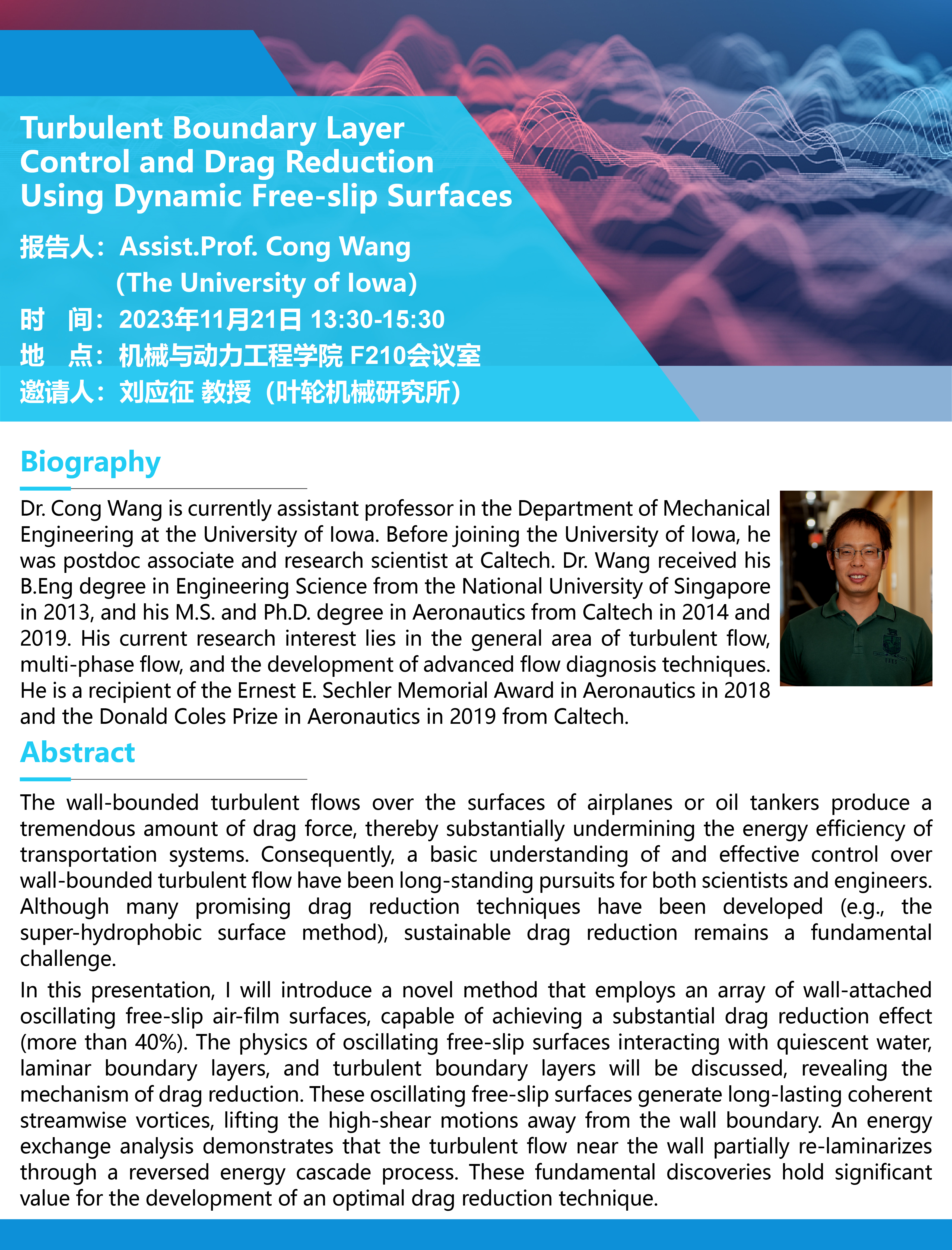 Dr. Cong Wang is currently assistant professor in the Department of Mechanical Engineering at the University of Iowa. His current research interest lies in the general area of turbulent flow, multi-phase flow, and the development of advanced flow diagnosis techniques. He is a recipient of the Ernest E. Sechler Memorial Award in Aeronautics in 2018 and the Donald Coles Prize in Aeronautics in 2019 from Caltech.