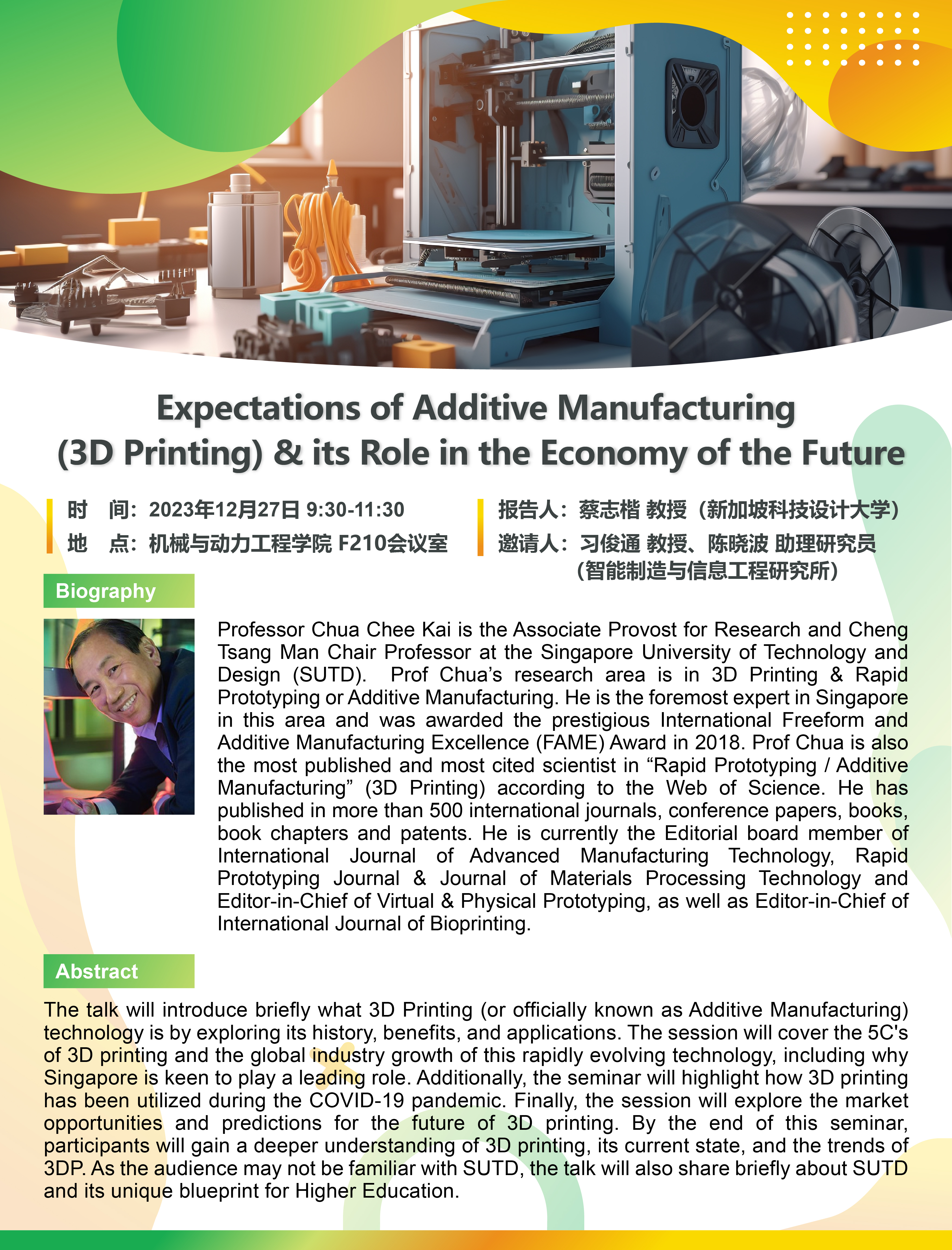 The talk will introduce briefly what 3D Printing (or officially known as Additive Manufacturing) technology is by exploring its history, benefits, and applications. The session will cover the 5C's of 3D printing and the global industry growth of this rapidly evolving technology, including why Singapore is keen to play a leading role. Additionally, the seminar will highlight how 3D printing has been utilized during the COVID-19 pandemic. Finally, the session will explore the market opportunities and predictions for the future of 3D printing. By the end of this seminar, participants will gain a deeper understanding of 3D printing, its current state, and the trends of 3DP. As the audience may not be familiar with SUTD, the talk will also share briefly about SUTD and its unique blueprint for Higher Education.