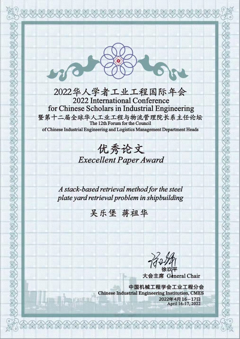 Recently, the 2022 International Conference for Chinese Scholars in Industrial Engineering and The 12th Forum for the Council of Chinese Industrial Engineering and Logistics Management Department Heads (CSIE2022& CIEDH2022) held online. Wu Lebao from Department of Industrial Engineering and Management at School of Mechanical Engineering, SJTU made an academic report entitled “A stack-based retrieval method for the steel plate yard retrieval problem in shipbuilding”under the guidance of Professor Jiang Zuhua, and won the Excellent Paper Award.