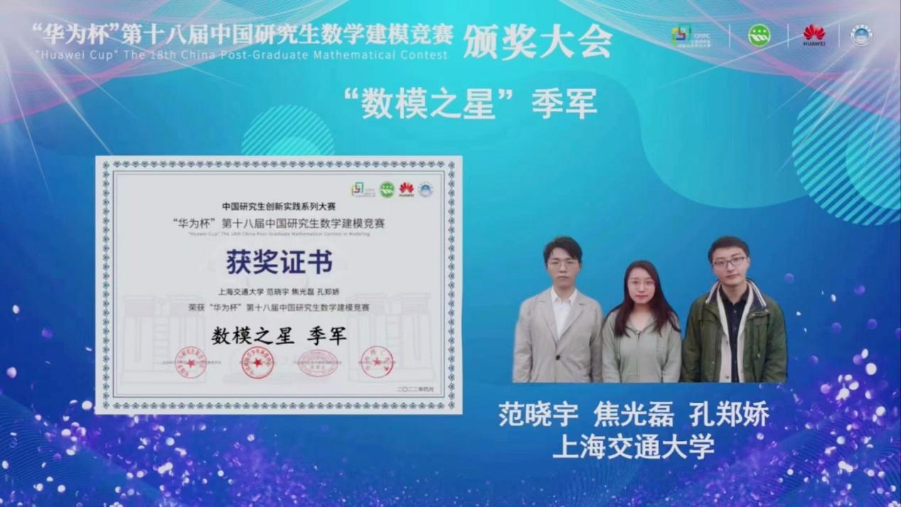 On April 24, 2022, the 18th China Post-Graduate Mathematical Contest in Modeling came to a successful conclusion. After the scoring and voting by the judges and the audience, the team consisting of Fan Xiaoyu, Jiao Guanglei and Kong Zhengjiao, graduate students of the Department of Industrial Engineering and Management at School of Mechanical Engineering, finally won the third runner-up of "Star of Mathematical Modeling" representing Shanghai Jiao Tong University, which is the best result achieved by Shanghai Jiao Tong University in the China Post-Graduate Mathematical Contest in Modeling.