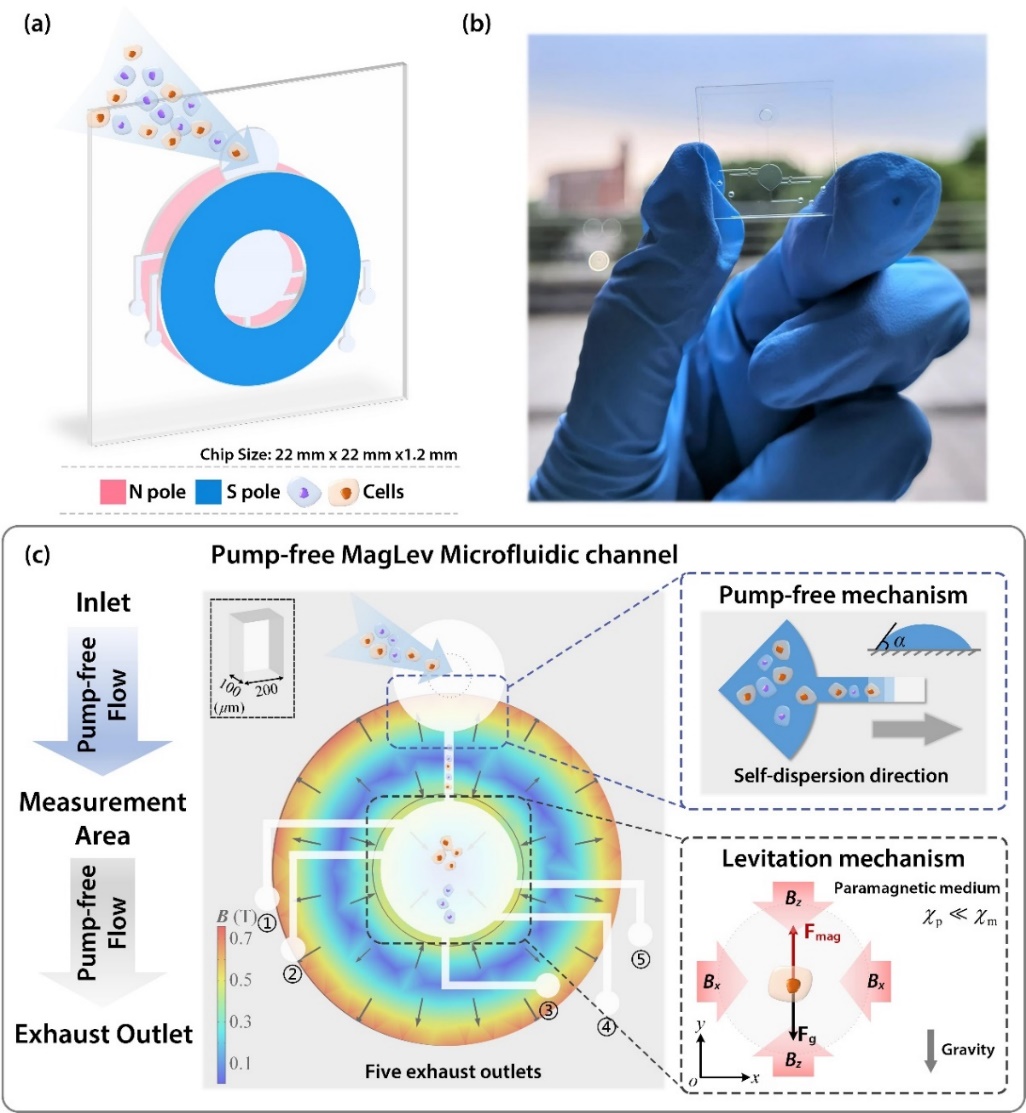 The proposed pump-free microfluidic MagLev platform, a low-cost, fully automatic and portable design for label-free density-based cell characterization, provides a universal detection tool that operate efficiently within small-volume environments.