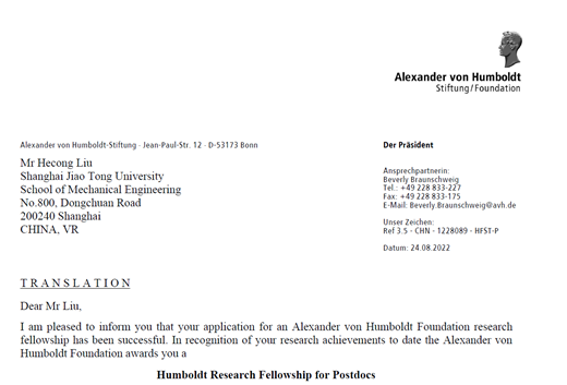 Recently, Hecong Liu, a recent doctoral graduate of the Institute of Turbomachinery at School of Mechanical Engineering, Shanghai Jiao Tong University, has been awarded a Humboldt Research Fellowship for Postdocs by the Humboldt Foundation in Germany. He will join Professor Christof Schulz's team at the University of Duisburg-Essen in Germany to research breakdown spectroscopy. Professor Christof Schulz is a winner of the Leibniz Prize, Germany's highest Science and technology award, and the editor-in-chief of Progress in Energy and Combustion Science.