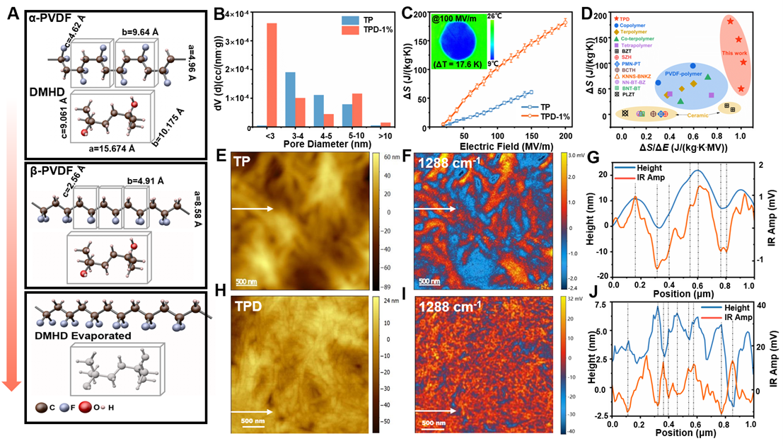 In this work, the team focusing more on the internal interface of the polar material rather than the 3 dimensional bulk crystals. In order to create the internal polar interfaces, they blended low-boiling-point polyol organic small molecules DMHD into relaxor ferroelectric terpolymers. Leveraging the intermolecular interactions between these components, they induced the self-assembly of the polymer's non-polar interfaces into polar conformations at the heterogeneous interfaces. This approach introduced an abundance of small, sub-nanometer polar pore with huge surface area of polar interfaces, significantly enhancing the material's entropy change. At a low electric field, the modified material achieved an entropy change of 100 J/(kg·K) which was four times greater than that of ordinary polymers, with an electrocaloric strength exceeding 1 J/(kg·K·MV), and demonstrated a cooling capacity of 5×103[a1] J/kg, maintaining stable cyclic operation over 3 million cycles.