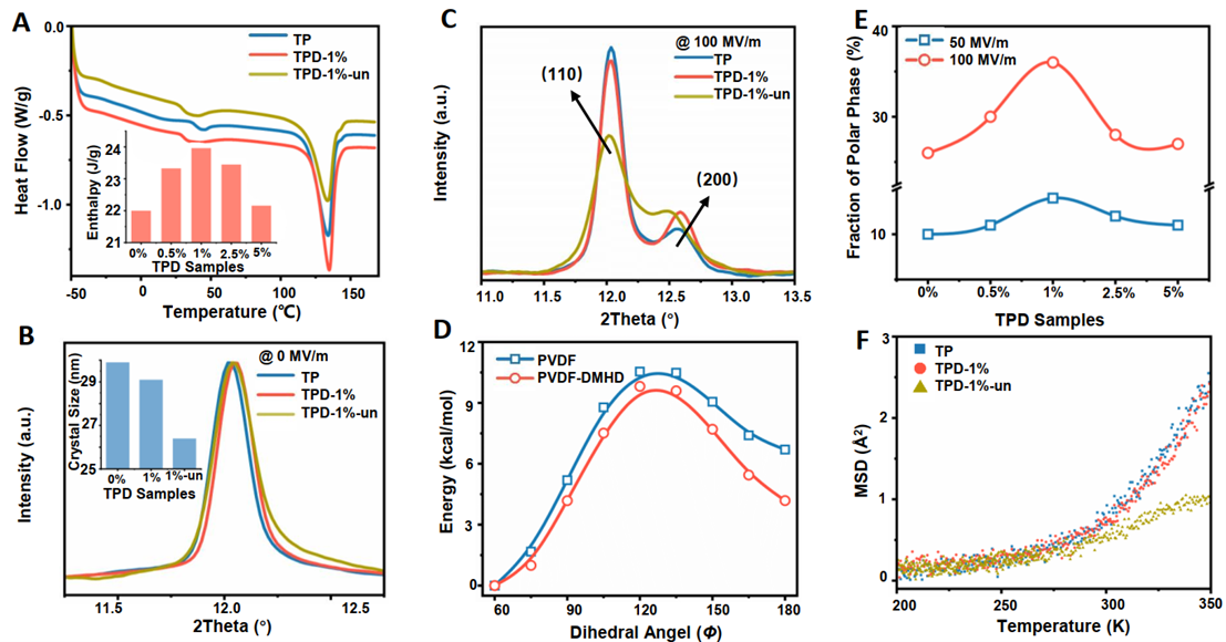 In situ Wide-Angle X-ray Diffraction (WAXD) studies under electric fields have investigated the dynamic transitions of the 3D bulk crystalline structures, showing that the introduced DMHD small molecules indeed induce a strong phase transition. Density Functional Theory (DFT) and Molecular Dynamics (MD) models also intuitively demonstrate that DMHD can lower the potential barrier for the non-polar to polar phase transition due to the presence of interface hydrogen bonding interactions.