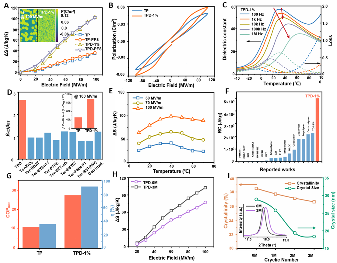 The colossal electrocaloric effect (ECE) in TPD is independent of temperature around room temperature and covers an effective temperature window from 10°C to 70°C, thus yielding the maximum Refrigerant Capacity (RC). Compared to conventional polymers, the coefficient of performance (COPmat) of TPD is increased by 250%, and the cyclic life of up to 3 million cycles (more than 70 days). This enhancement could further reduce the size and weight of power sources, powering potential portable electrocaloric cooling devices.
